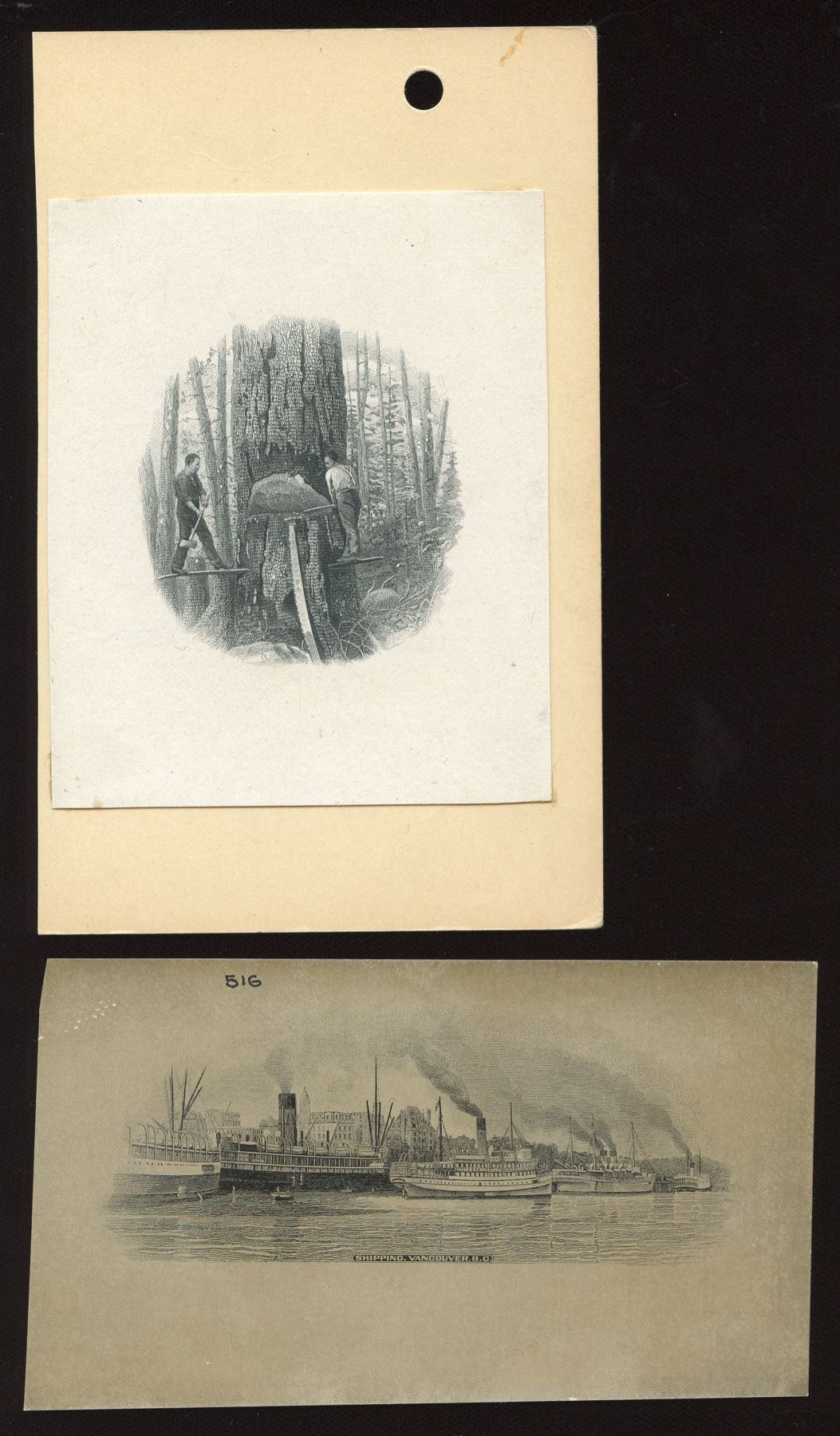 Bank of Vancouver, ships in Vancouver harbour, photograph (?) of vignette, as on $5 note. Die proof vignette printed on thick paper and mounted on card, two men cutting giant fir tree, on $10 note. Two items.