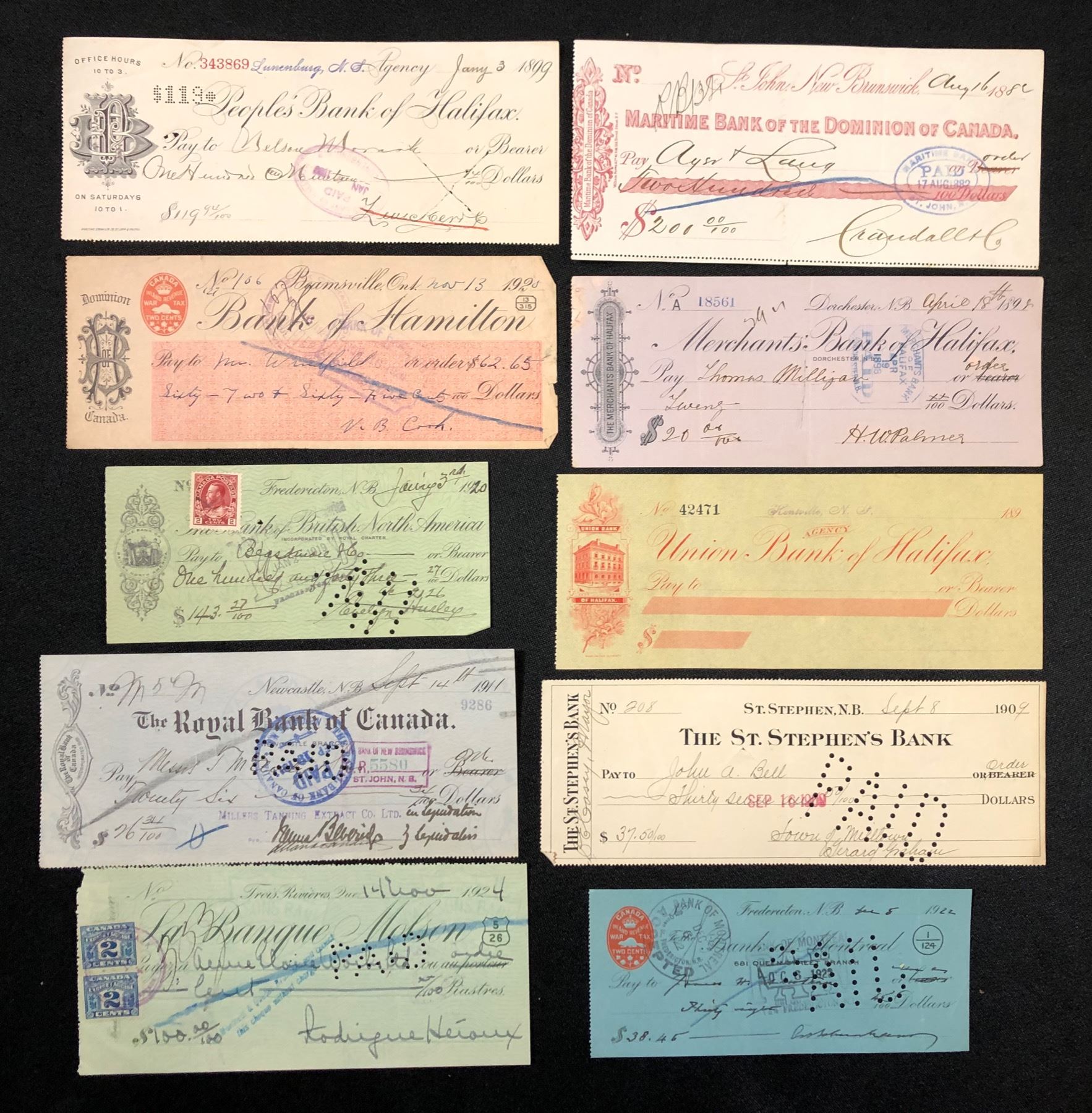 10 scarce cheques Peoples Bank of Halifax, Bank of Hamilton, Bank of British North America, Maritime Bank of the Dominion of Canada, Merchants Bank of Halifax, Union Bank of Halifax, St. Stephens Bank, Royal Bank of Canada, Bank of Montreal, La Banque Molson (All dated early 1900's or late 1800's) 10 pcs