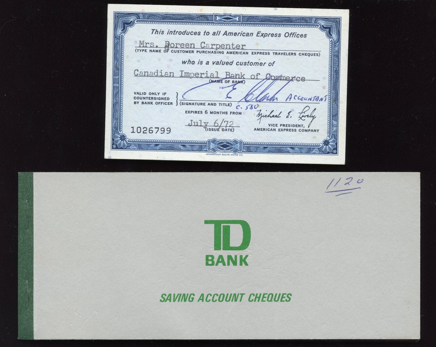 From Mrs. Carpenter; Bank of Montreal receipt, American Express Identification Card, TD Bank Savings Account Cheques. CIBC Memorabilia - From the personal collection of Dennis M Carpenter, former Executive with the Canadian Imperial Bank of Commerce