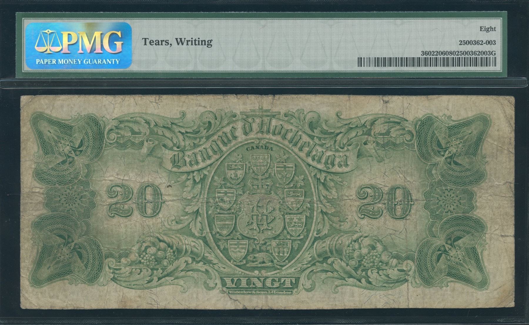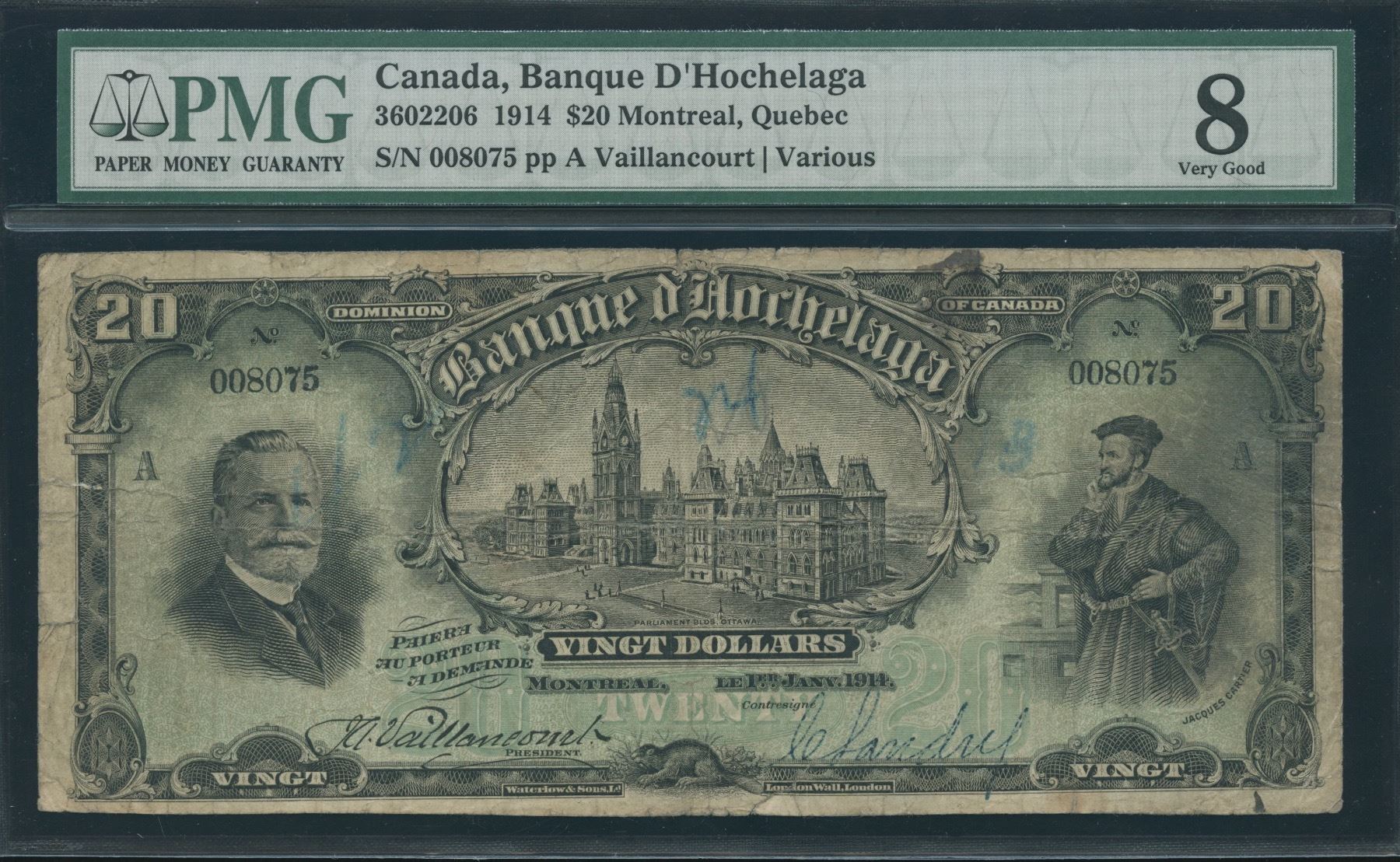 CH 360-22-06. PMG Very Good 8, tears and writing. Rarely offered note with only 3 on the registry, featuring Jacques Cartier. S/N:008075/A.