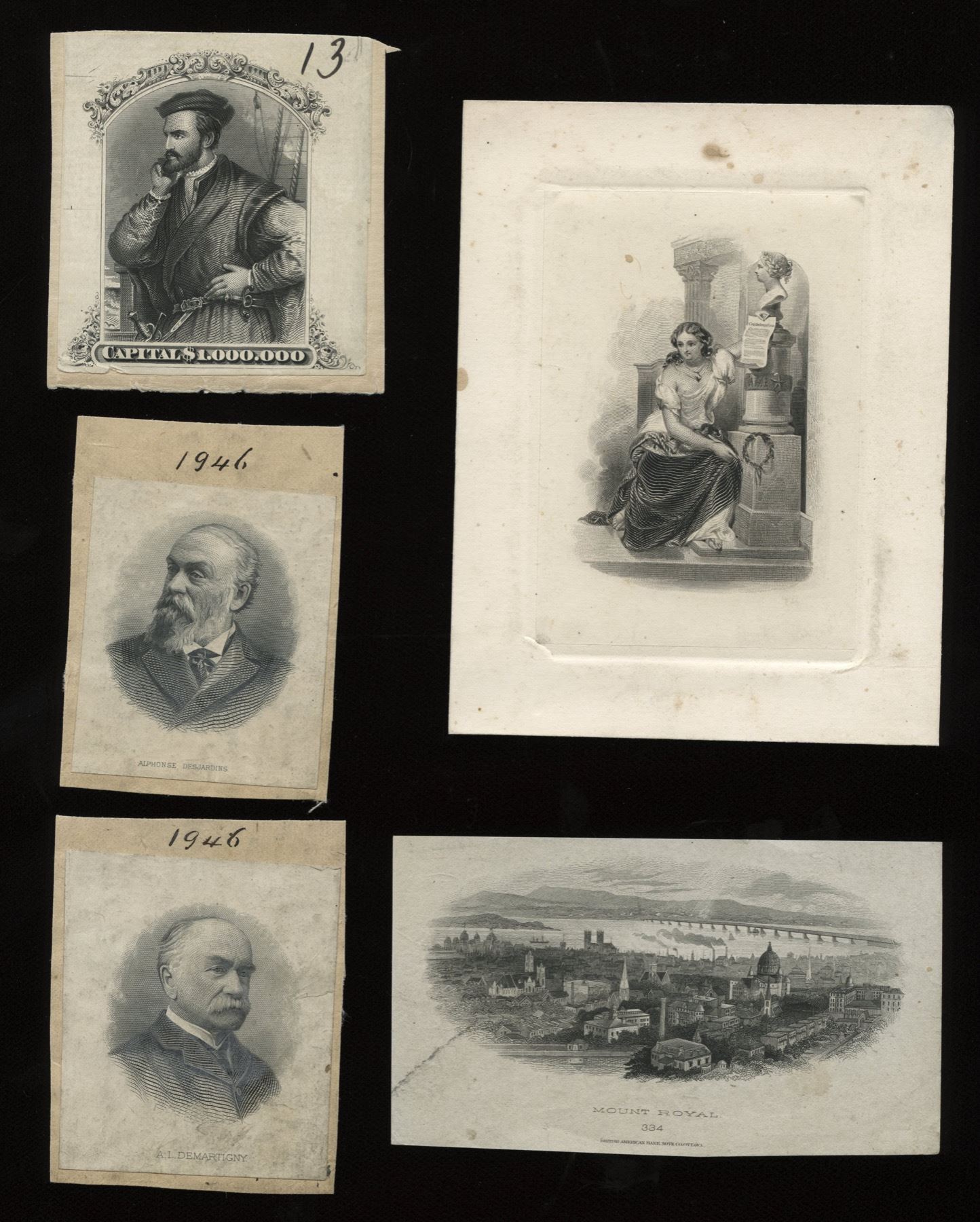 Banque Jacques Cartier, Jacques Cartier portrait on 1870 issue, cut down, remounted, with notation; also seated woman seen in reduced format on the $50, plus the three principal vignettes on the 1895 $5 face, both portraits cut down and numbered. Total of five vignettes.