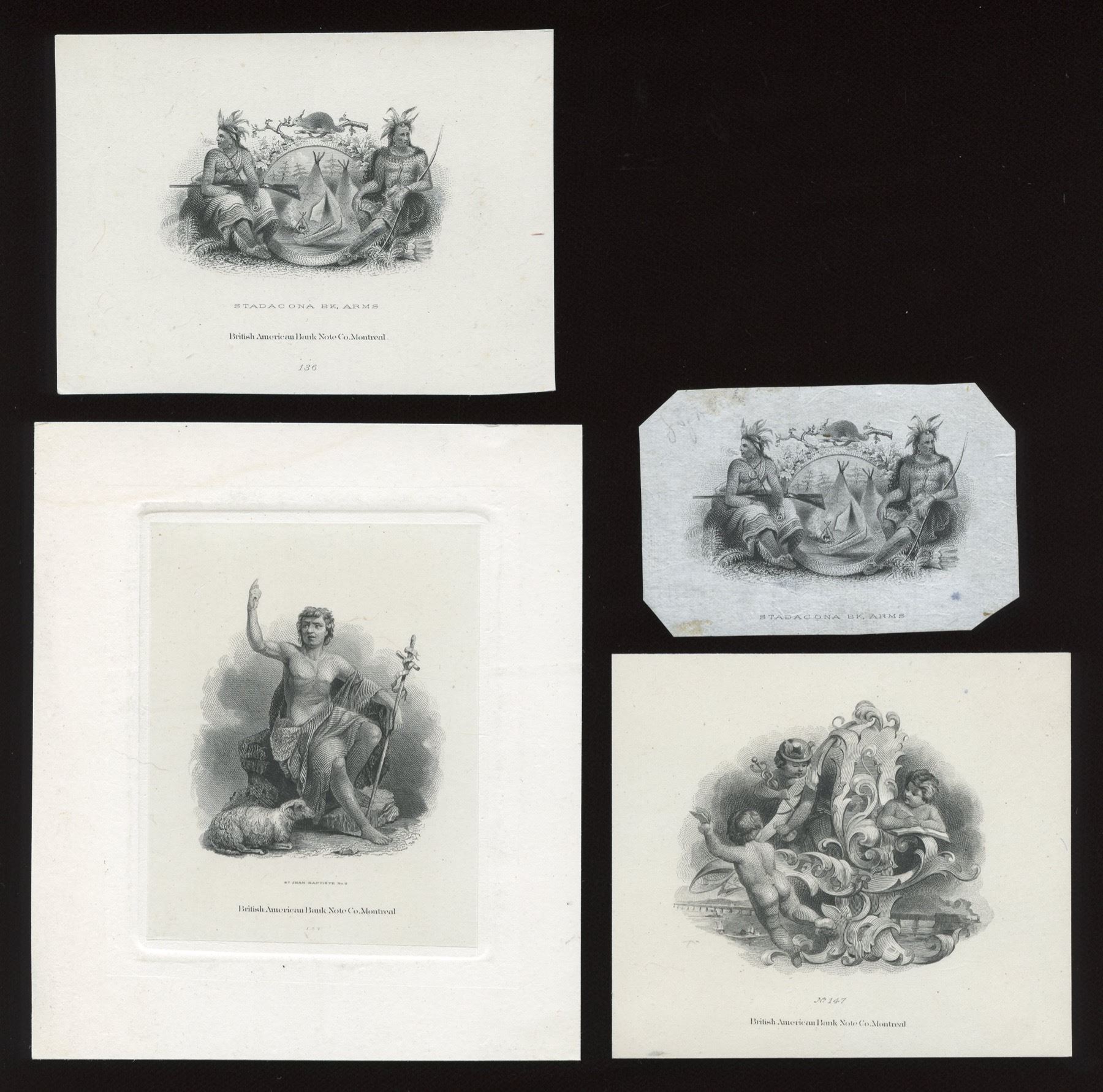 Banque St. Jean Baptiste, Ornate 4 with cherubs and Victoria Bridge in the background, and "St. Jean Baptiste No. 2", this vignette found on all three denominations of the bank. Stadacona Bank, "Stadacona Bank Arms" (2), not found on notes but presumably engraved for use on other documents. Four BABN die proof vignettes, from two rare banks.