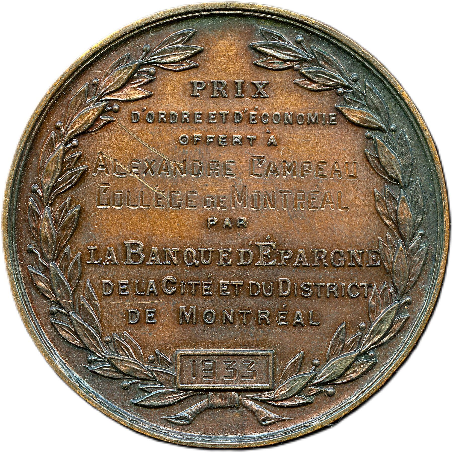 Banque d'Épargne de la Cité et du District de Montréal Medal. Copper, 50.3mm, 45.1g. Awarded to Alexandre Campeau College de Montreal 1933. EF.