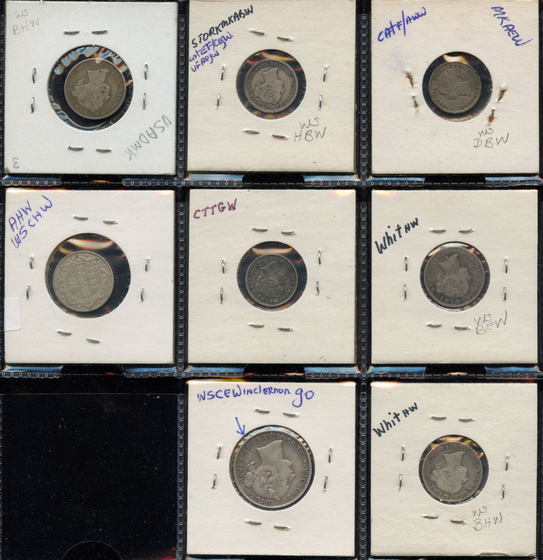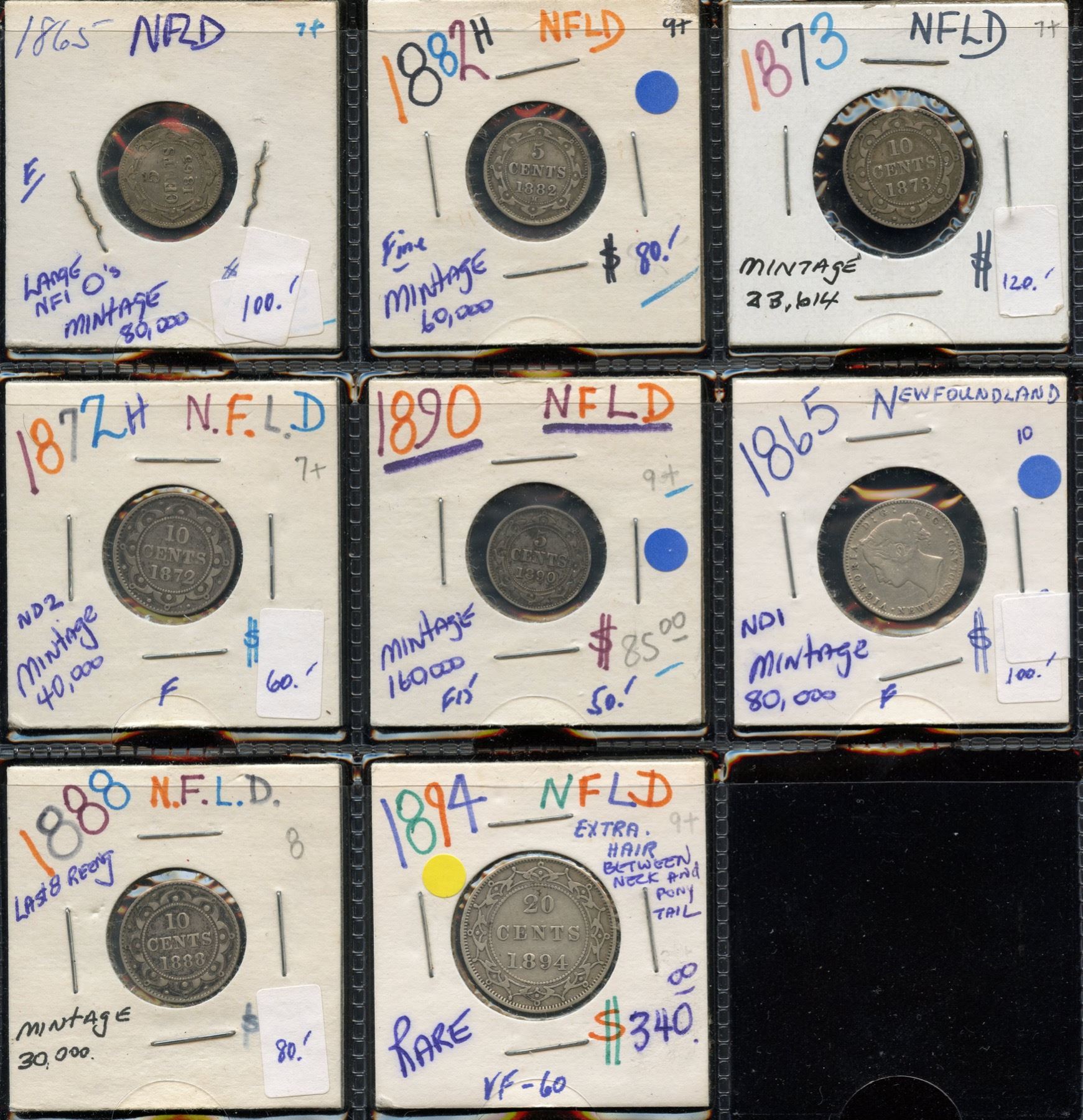 Includes: Five Cents: 1865, 1882H, 1890. Ten Cents: 1865, 1872H, 1873, 1888. Twenty Cents 1894. All average VF grades. 8 Pcs.