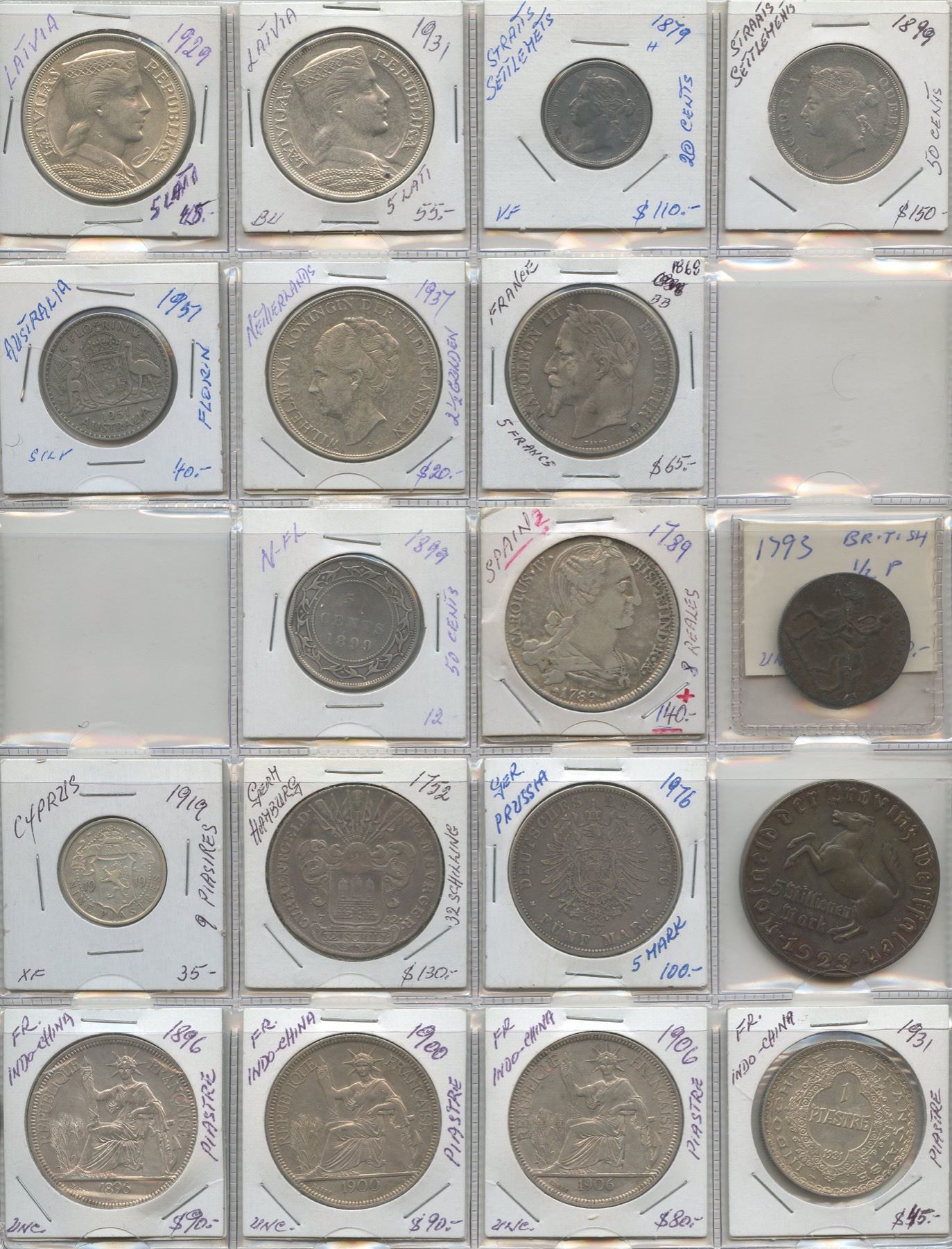 Includes: Cyprus 1919 9 Piastres, VF. Latvia 1929 & 1931 5 Lati, AU's. Straits Settlements 1879H 20 cents, VF (cleaned) & 1899 50 cents, VF. Australia Florin, Fine. French Indo-China 1896, 1900, 1906 & 1931 Piastre, EF or better. Many more, inspection is recommended, nice lot of 18 Pcs.
