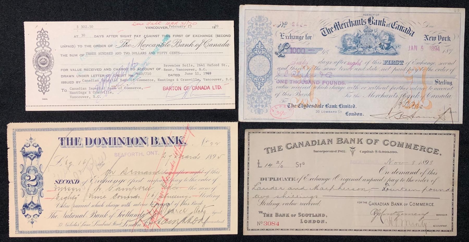 Bills of Exchange: Merchants Bank of Canada, 1894, printed in blue and gold; Dominion Bank, Seaforth, Ont. 1895, printed in blue; Canadian Bank of Commerce, 1898, printed in black on gray paper, small split in upper margin. Also Mercantile Bank of Canada, 1970. Four items.
