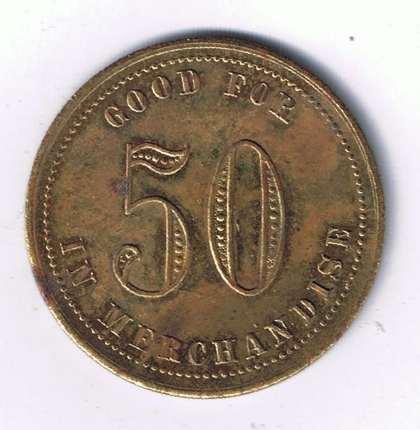 Bo. 404-L-Ex. Brass, Good for 50 in Merchandise. 31mm.