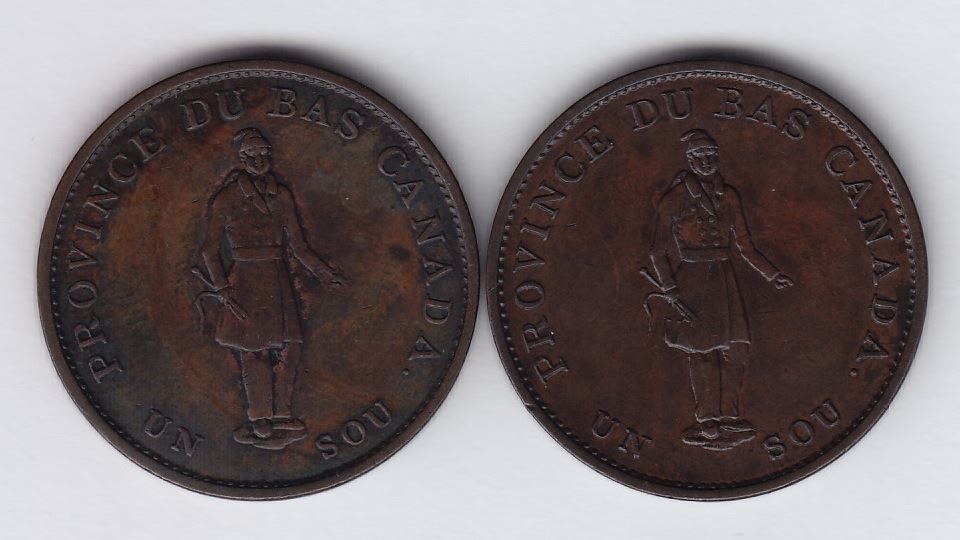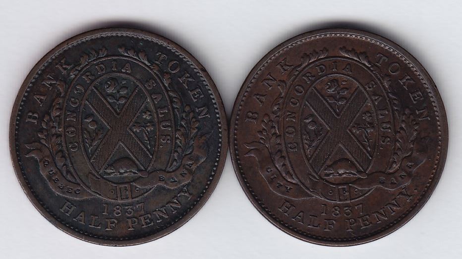 Br. 522. City Bank halfpenny, 1837. - CH LC-8A2. Low "v", right serif of that letter defective. VF-EF; another of same, but with die break from foot at right to "s" in "sou" to border, and another from lower curve of "P", which is double cut at outside vertical stroke, to vertical stroke of "r". Strong EF. 2 Pcs.