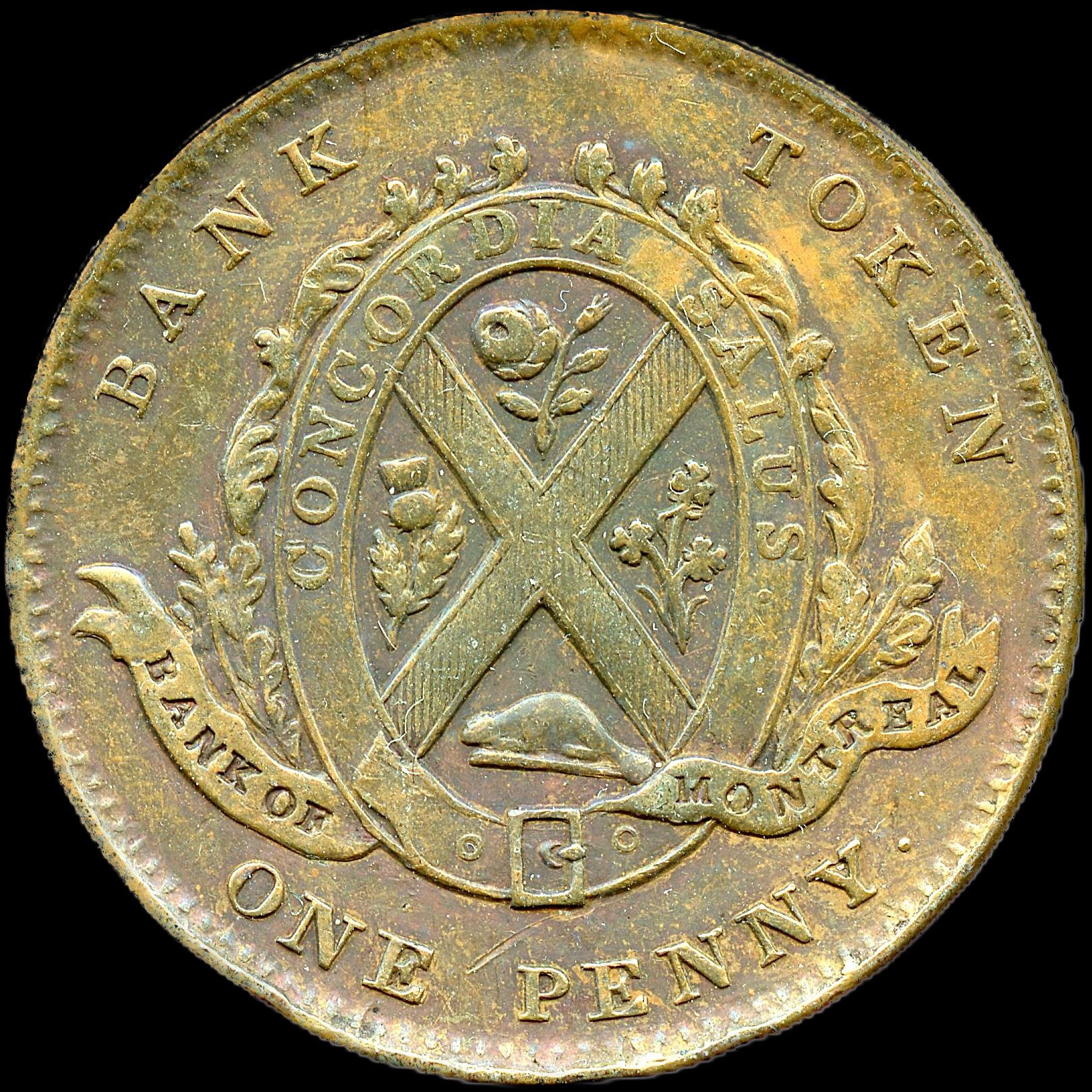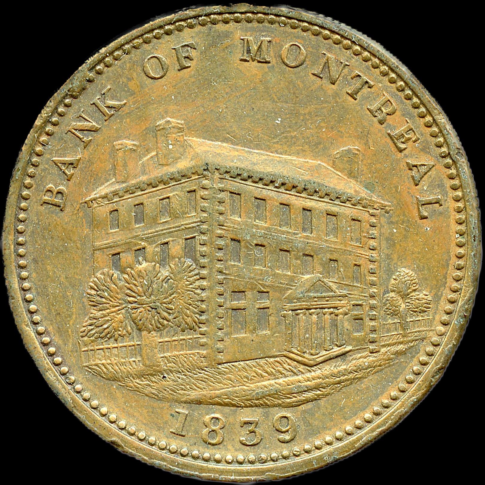 Br. 523. Bank of Montreal 1839 Side View One Penny Token. CH-LC-11B, Co. 38, 33.8mm, 18.1g. Surfaces are unnaturally subdued from an old cleaning, but still very pleasing to the eye. Strong details, EF. 1pc. Ex. Richard Bladworth Angus (May 28, 1831 - September 17, 1922) was a Scottish Canadian banker, financier, and philanthropist. He was a co-founder and vice-president of the Canadian Pacific Railway, president of the Bank of Montreal.