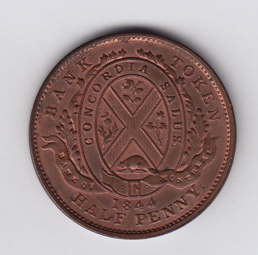 Br 527 - 1844 Frontview Halfpenny, PC-1B3, heavy trees, Courteau 55, red Unc.