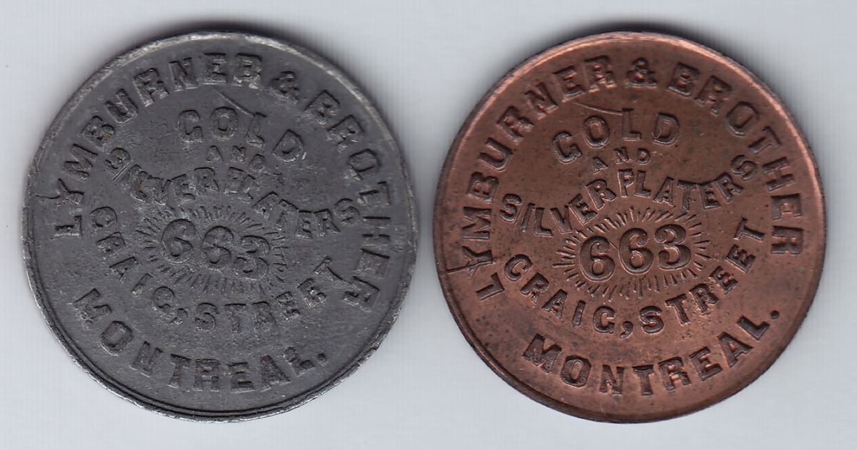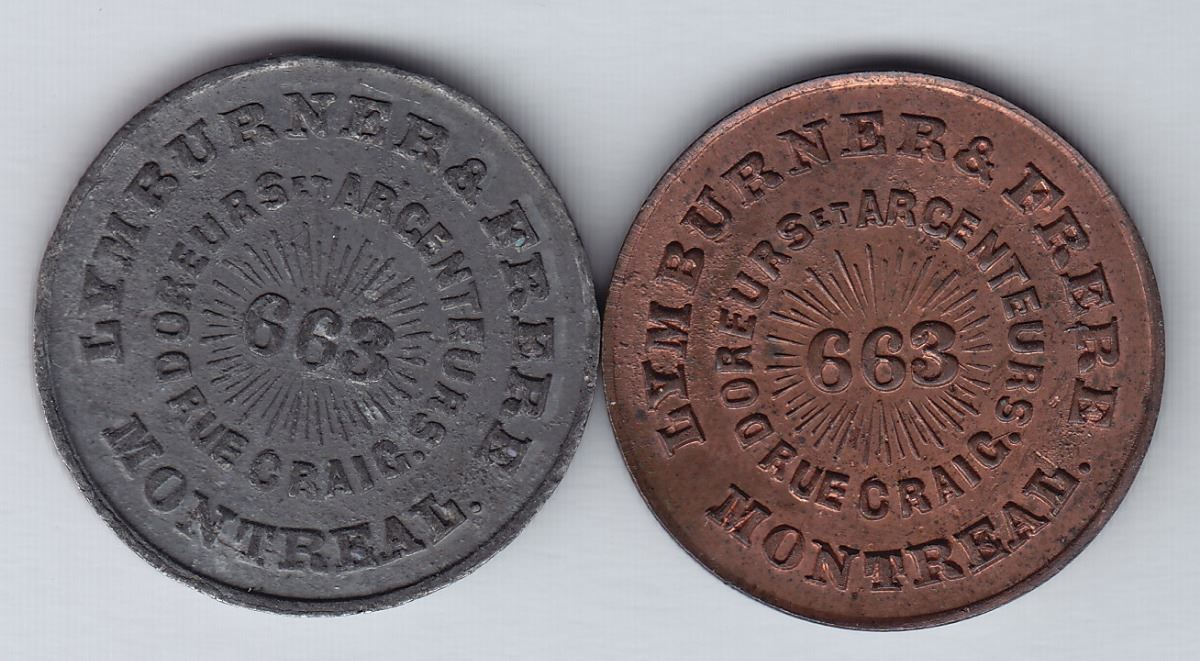 When at 663 Craig Street in 1878-79. Two pieces, in Copper, Unc., and in White Metal, E.F.The dies for the token were sold to Woodward, and were purchased by Leroux who claimed to have had 100 struck. These would be pieces that Leroux had struck as the earlier pieces by Lymburner were on thinner flans.