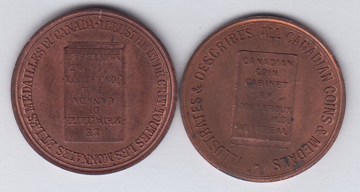 The French and English versions of Dr. Leroux's Card advertising his first edition of The Canadian Coin Cabinet, published in 1888, and he notes the honour of having had the French Government subscribe for a copy. His second, more complete and much rarer edition was published the following year. 2 Pcs.