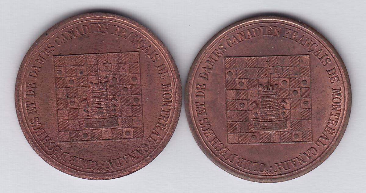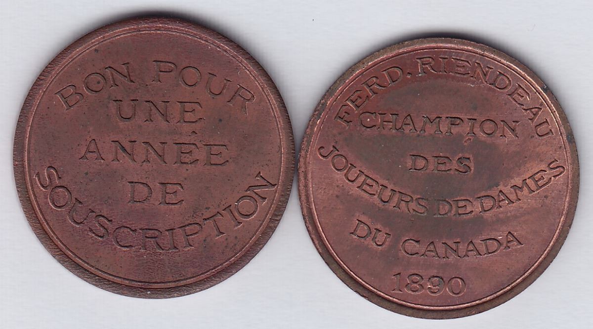 Two tokens for the Checker Club which became amalgamated with the Chess Club in 1891. Dr. Leroux was commissioned to order 100 of the first type, but the order was most certainly for a far greater quantity. The second token celebrates Ferdinand Riendeau, the champion checker player of Canada in 1890. Copper. Unc. 2 Pcs.