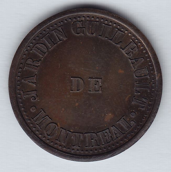 (The French expression for twenty-five cents). Breton relates an interesting story regarding Leroux's visit to the Birmingham medalist, J. Moore, and ordering 500 of the pieces. That population seems accurate, as the piece is not common. The Gardens were a great attraction in Montreal for many years. Joseph E. Guilbault was an early member, noted as a founder, of the Numismatic & Antiquarian Society of Montreal. The Gardens, which moved about, were first established around 1835. With the Gardens, Guilbault also had established a Museum of Curiosities by 1863, and perhaps slightly earlier. Copper. Deep Brown. Unc.