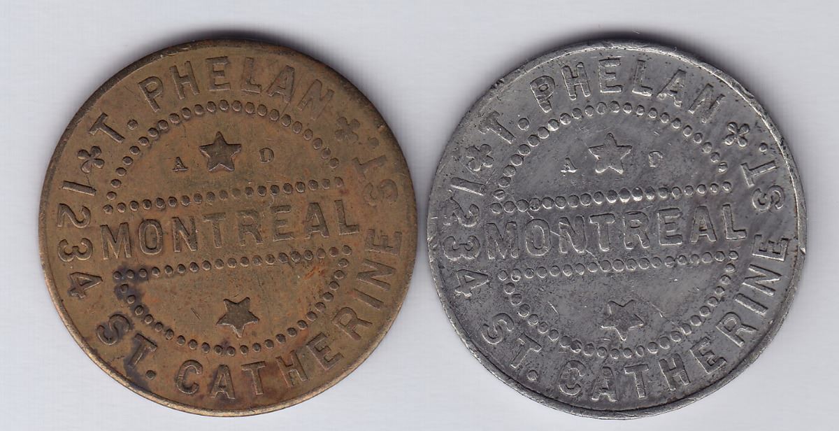 500 issued in 1888 by Sergeant Desjardins, then of the Montreal Police Force. This was likely the Alfred Desjardins, living on Notre Dame Street, Montreal, a collector of coins, medals, and tokens. Specimens in White Metal and Brass. Both VF, the brass piece with rust stains, but not really disturbing. This last from the Buckley/Lepcyk Sale, November, 1981; Ex:Henderson. 2 Pcs.