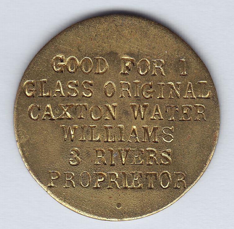 Williams incused token For Glass Original Caxton Water. The likelihood is that this token preceded the die struck piece offered in the preceding lot. Brass. Unc. Much nicer than the Temple specimen offered in the Bell Sale, September, 2012, which realized $425. (hammer price). This is the late Rev. Bernard O'Connor's specimen which fetched $275. (hammer price).