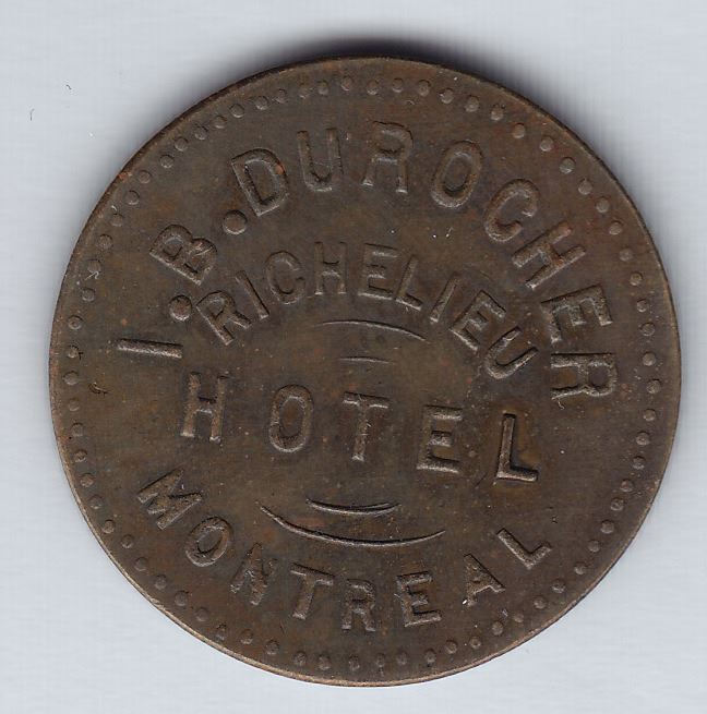 (100 issued) Brass. AU. Ex:Buckley/Lepczyk Sale; ex-Henderson. The tokens were never used in the hotel; there are incused pieces in german silver that were used. The hotel was the leading French hotel in Montreal, according to McLachlan who claimed, as did Breton later, that only 100 were struck.