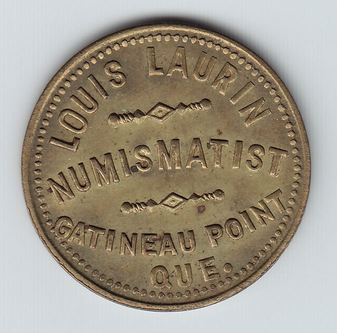 Brass. Unc. (300 issued). Louis Laurin was in the insurance business, and sold insurance to Doug Ferguson in the early 1930s. He was a collector and had what may have been the best collection of Canadian communion tokens. He was also a bookseller, issuing catalogues offering Canadiana and Americana in the mid to late 1920s, and the inside of the front covers advertised his collection of communion tokens which was for sale at $1000. He was a member of the A.N.A. early on, but dropped out before 1913.