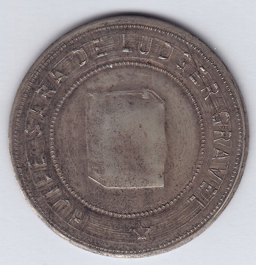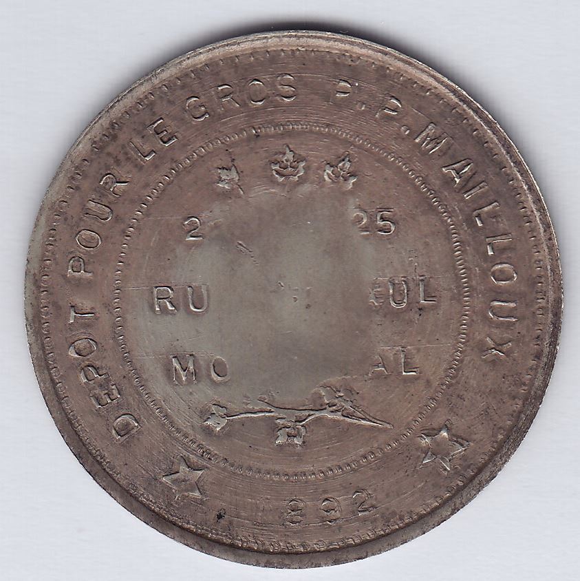 For his Sara brand of oil, 1892. Silver, or German Silver. Struck on a very thin flan, and poorly struck up at that, the can of oil effacing the central portion of reverse due to the very thinness of the flan. Even the oil can on obverse has not taken up the text impression. There is a cut through part of Gravel's name, indicating that the piece may have been rejected. Interesting, and definitely rare.
