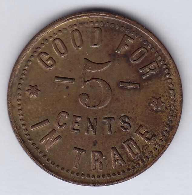 5c In Trade. This is slightly scarcer than the preceding piece. These two tokens have the distinction of being the earliest Canadian Military Canteen tokens. Yarwood notes them in his Guide to British military tokens, as the first numbers in his "Canada" section. Brass. EF.