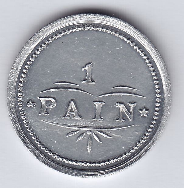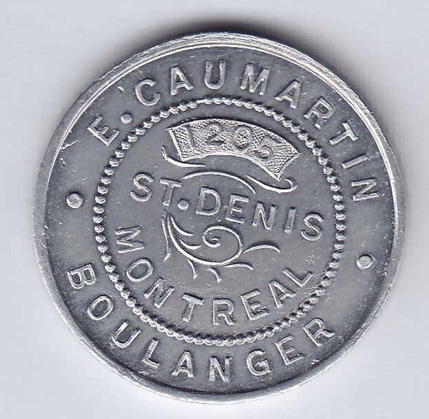 1206 St. Denis, Montreal. 1 Pain. Al. A.U. (25 struck) This mintage seems absurd as the token is much too common. Aluminum. AU.