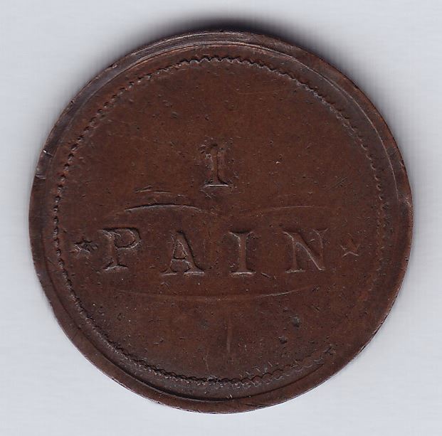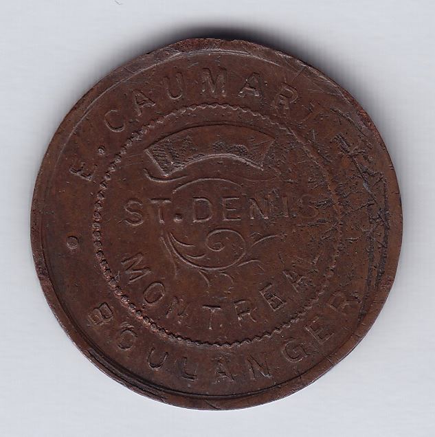 1206 St. Denis, Montreal. 1 Pain. Copper Plated White Metal. N.S. All others of the series are N.N. Poorly made, only the "1" of address is struck up and the area has some kind of graffiti within; there are also some slashes in the left obverse border, otherwise EF. There was a lead piece, as well as a copper (perhaps this type) in the Temple Sale, May, 2013.