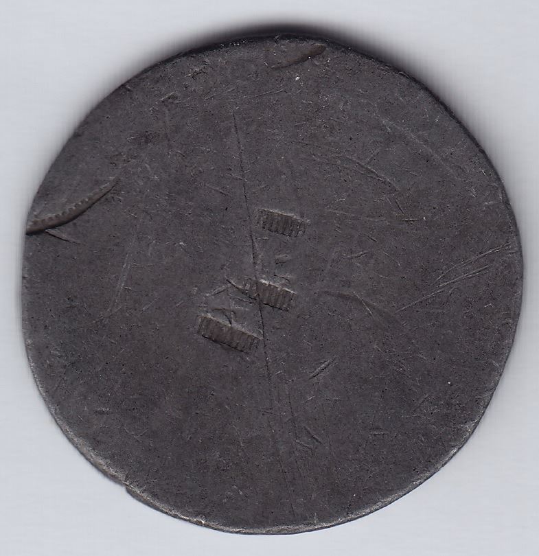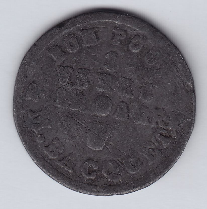 Lead. Thick Flan. Fine. The Charlton plate piece (6th edition, p. 244). Breton presented a small business history, writing that though it dated to between 1852 and 1861 none were known until a small hoard came to light in 1892. McLachlan denounced the piece as a fraud due to it being cast. It is not cast, but die struck, but he is probably right about it not having been issued by the hotelkeeper, Bacquet. These "fantasies" were eagerly sought after by collectors of the day, and McLachlan himself had a very complete collection of them.