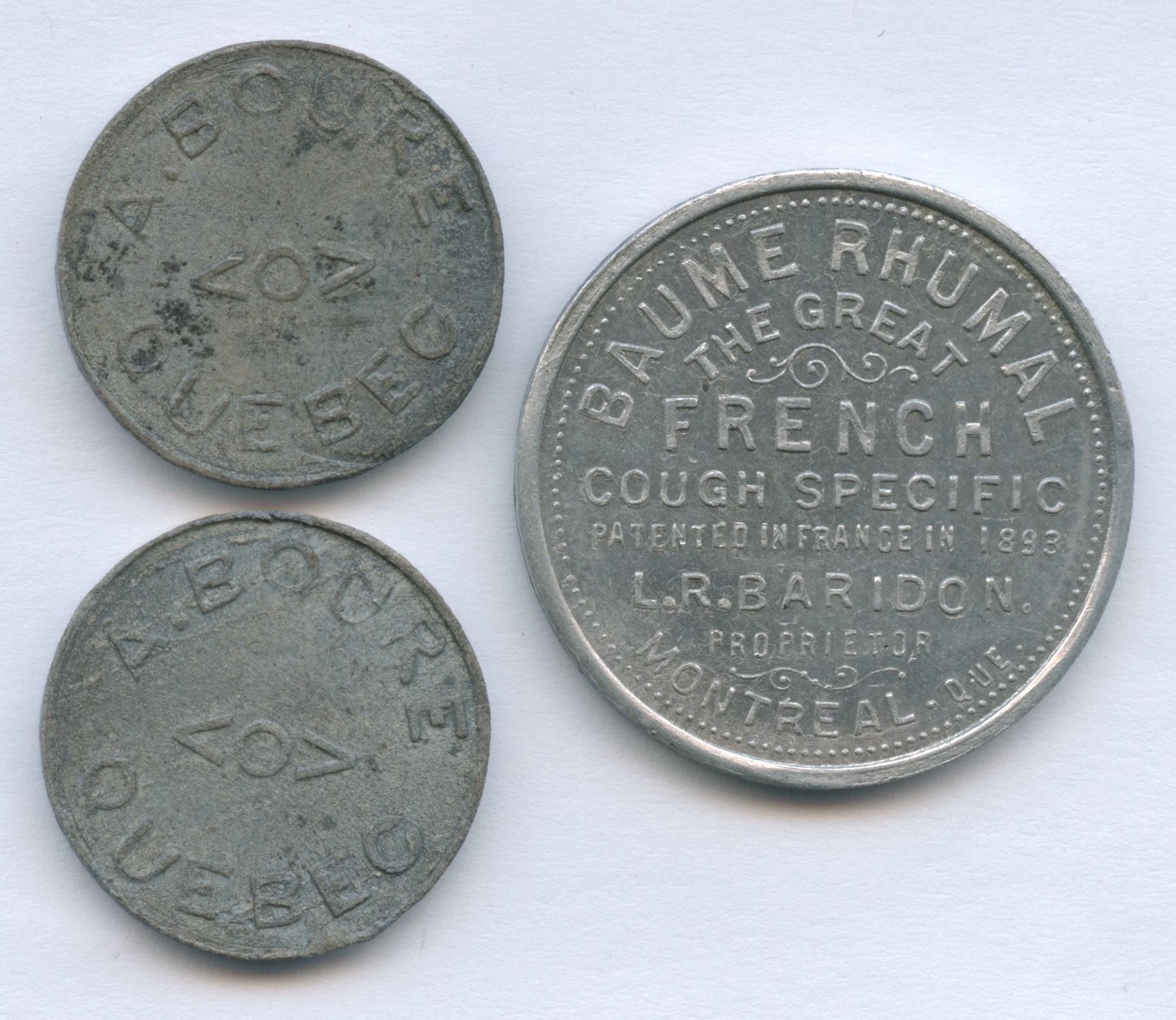 Br 664. L. R. Baridon's Baume Rhumal, by Charles Tison. This token doubles as a numismatist token, Baridon having formed two collections, the first of which he sold to Breton. Examples of his bottle of Baume Rhumal are not infrequently met with. Aluminum. EF. Br 665. A. Boure's Token, Quebec. 1 Pain. Alfred Boure is not noted in the 1890 Quebec directory, but is identified in 1896 as being at 47 Ste. Marguerite Street. The "C" may represent "Chaude", or warm bread. Lead. EF. Br 666. A. Boure's Token, Quebec. ½ Pain. Lead. Fine. 3 pcs.