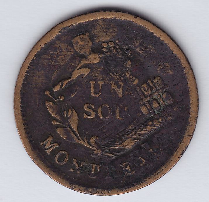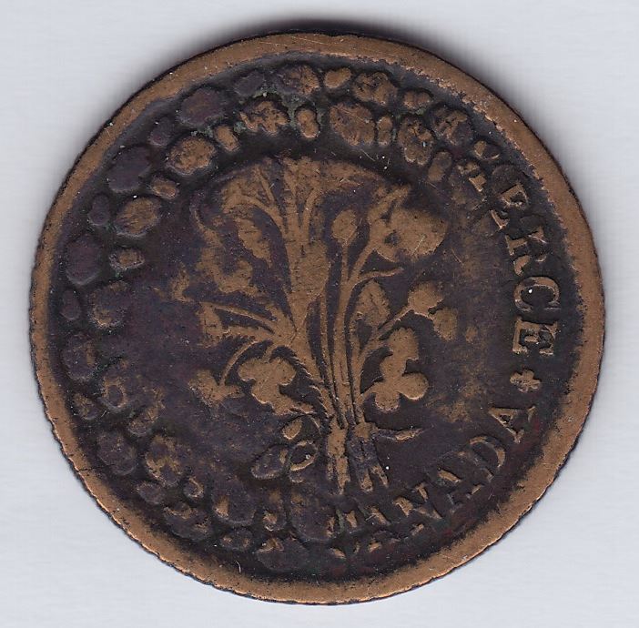 Brass, light milling. CH LC-40A10. Overstruck on the so-called Tiffin ½ p., 1812. CH LC-48C. A good part of the Tiffin reverse can be seen on the bouquet reverse. Fine.