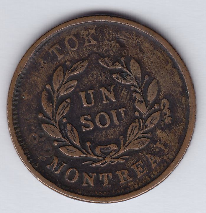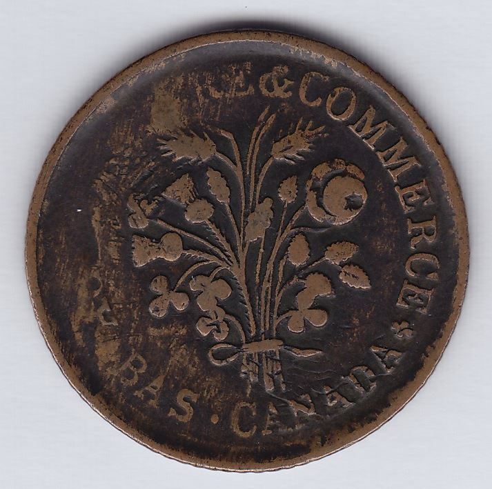 Brass, deep milling. CH LC-40A10. Overstruck on Bust & Harp ½ p., Br 1012. The top of harp and date numbers 182 can be seen on the reverse side of this piece. CH LC-60. Fine.