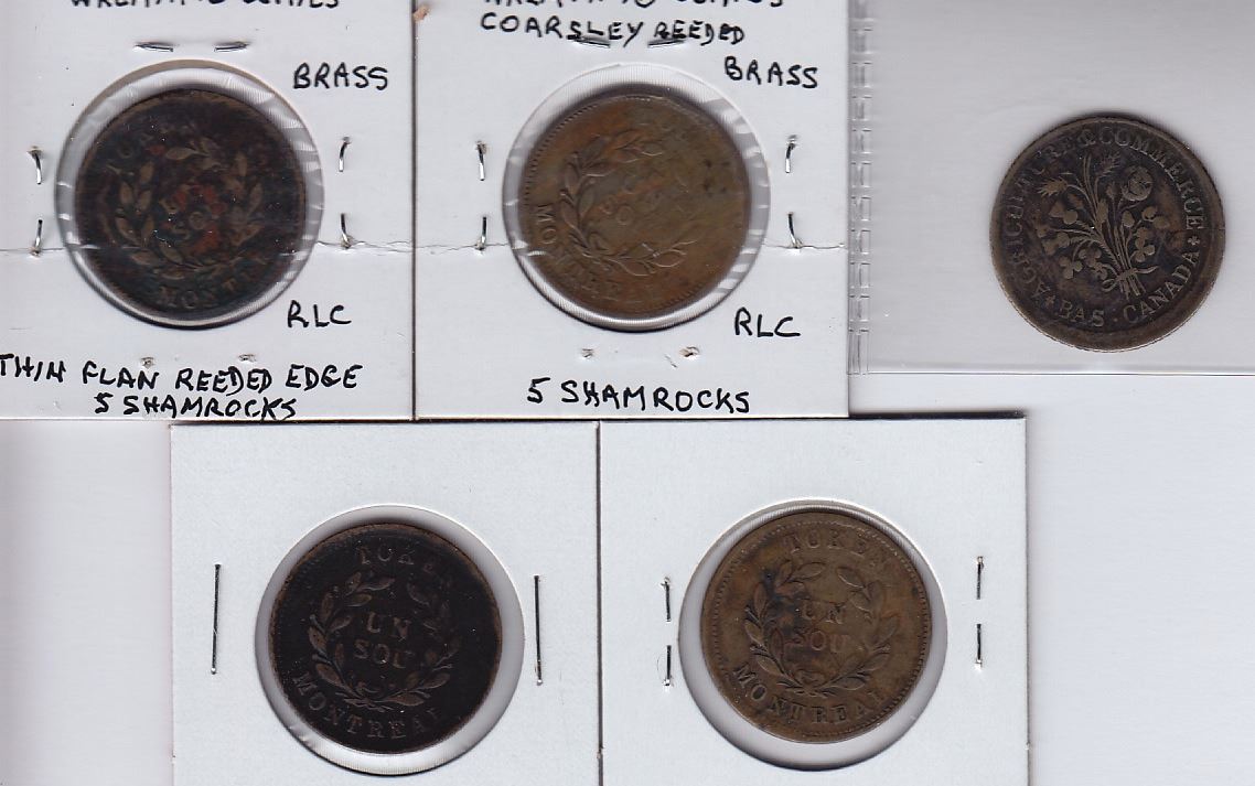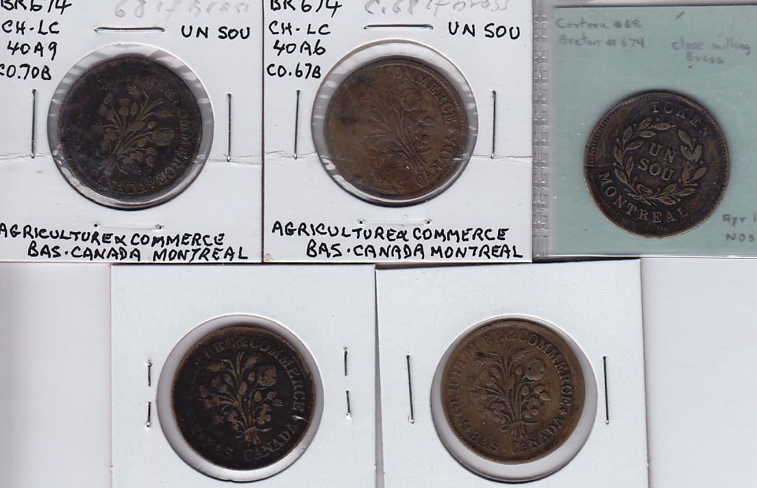 Brass, fine (deep), narrow milling, little off-centre at right obv.; another brass, narrow and lighter milling, similarly off-centre at the bottom; three others, inventoried as brass, but perhaps not. CH LC-40A. C. 68. VG-VF. 5 Pcs.