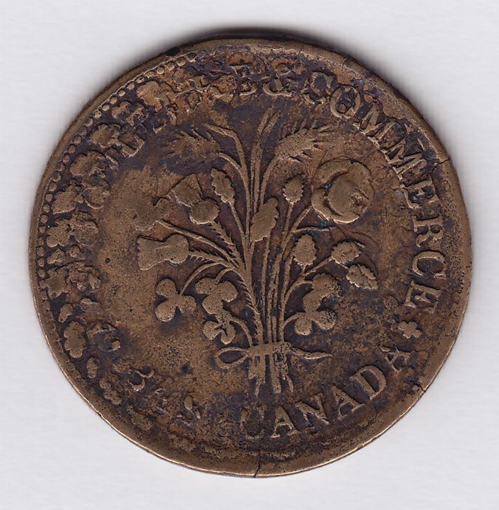 Br 674 - CH LC-40A-10, overstruck on a Tiffin halfpenny, Br 960, brass, evidence of a coarsely reeded edge, F-VF. The overstrikes of Breton 674 are probable evidence that the brass Tiffins and Bust & Harps were no longer acceptable by the last years of the 1830s and could be bought up in quantity rather cheaply. At the same time, the maker of this bouquet sou, possibly Jean-Marie Arnault, capitalized on the acceptance of the sous to re-circulate the rejected brass pieces at a profit by using them as his planchets.