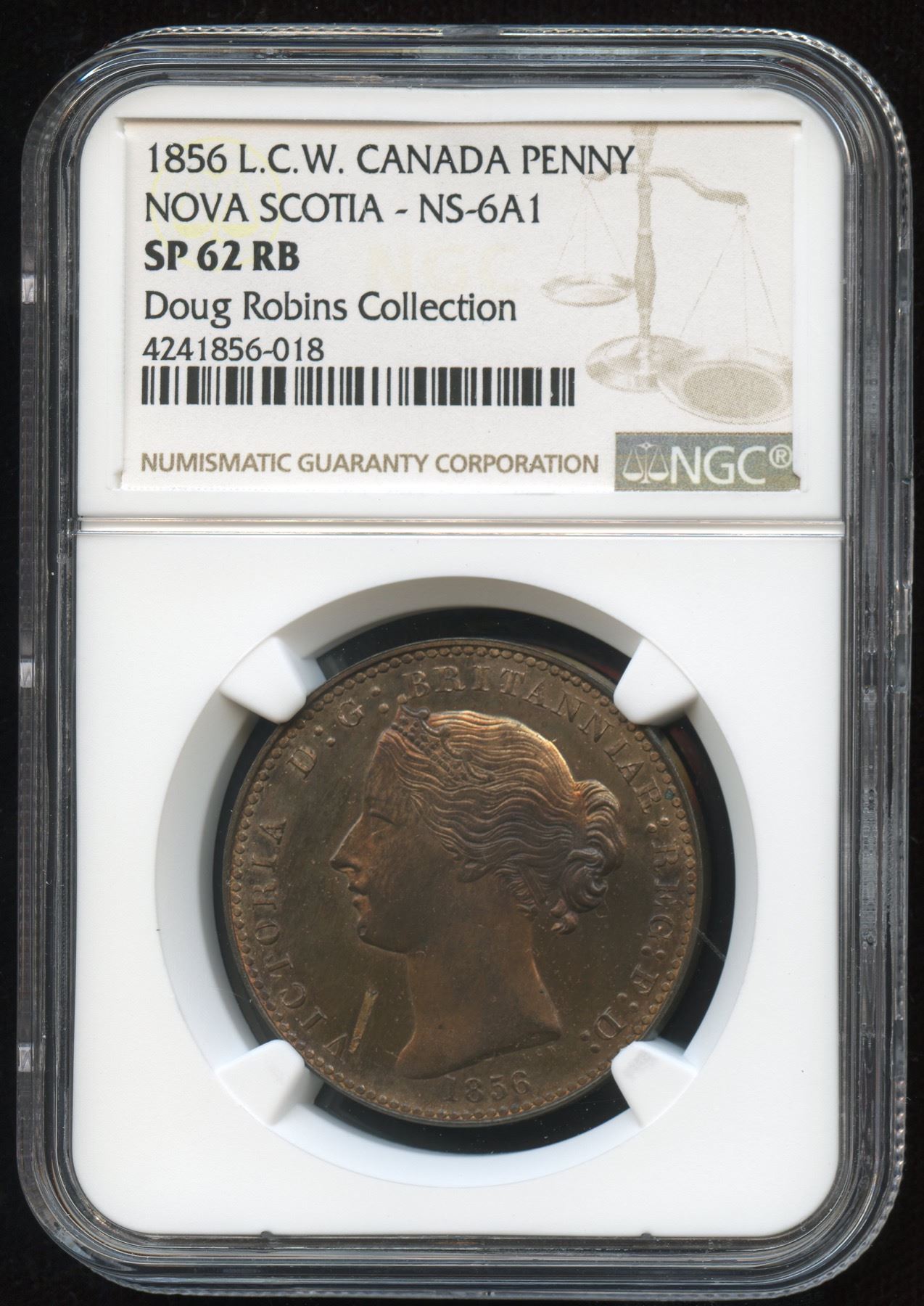 Br. 875, CH NS-6A1, NGC Specimen-62, Red & Brown. This attractive token displays near Gem surfaces with 40% remaining original red lustre. The only distraction is an area of de-lamination on the obverse. A rare token from the Doug Robins collection.