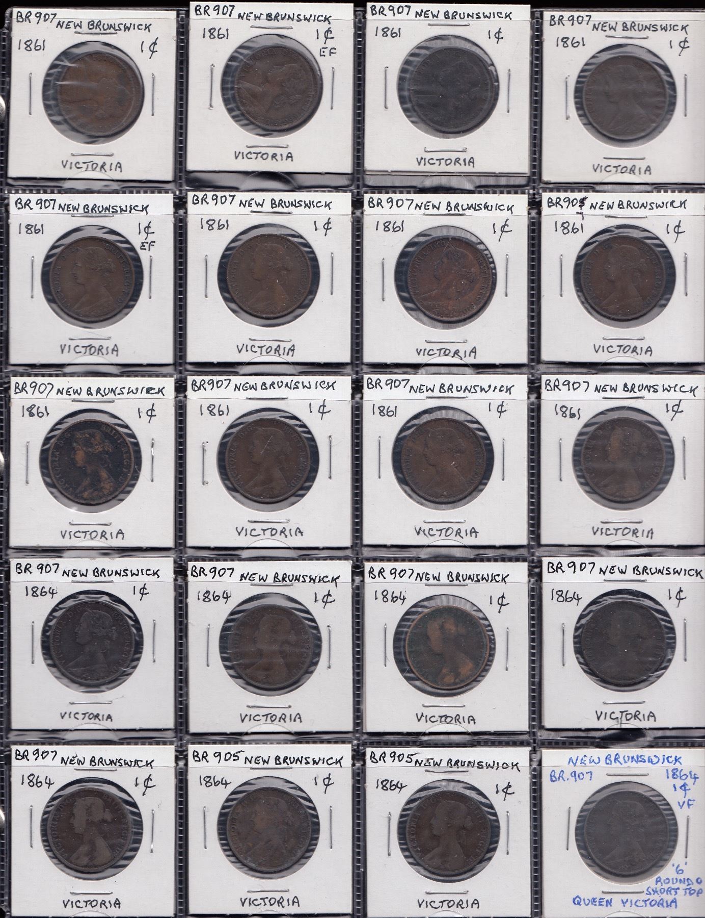 Group of 27 New Brunswick one cent pieces, comprising 12 x 1861, 15 x 1864. Grades range from VG to nearly EF, averaging F-VF, though some with issues. 27 Pcs.