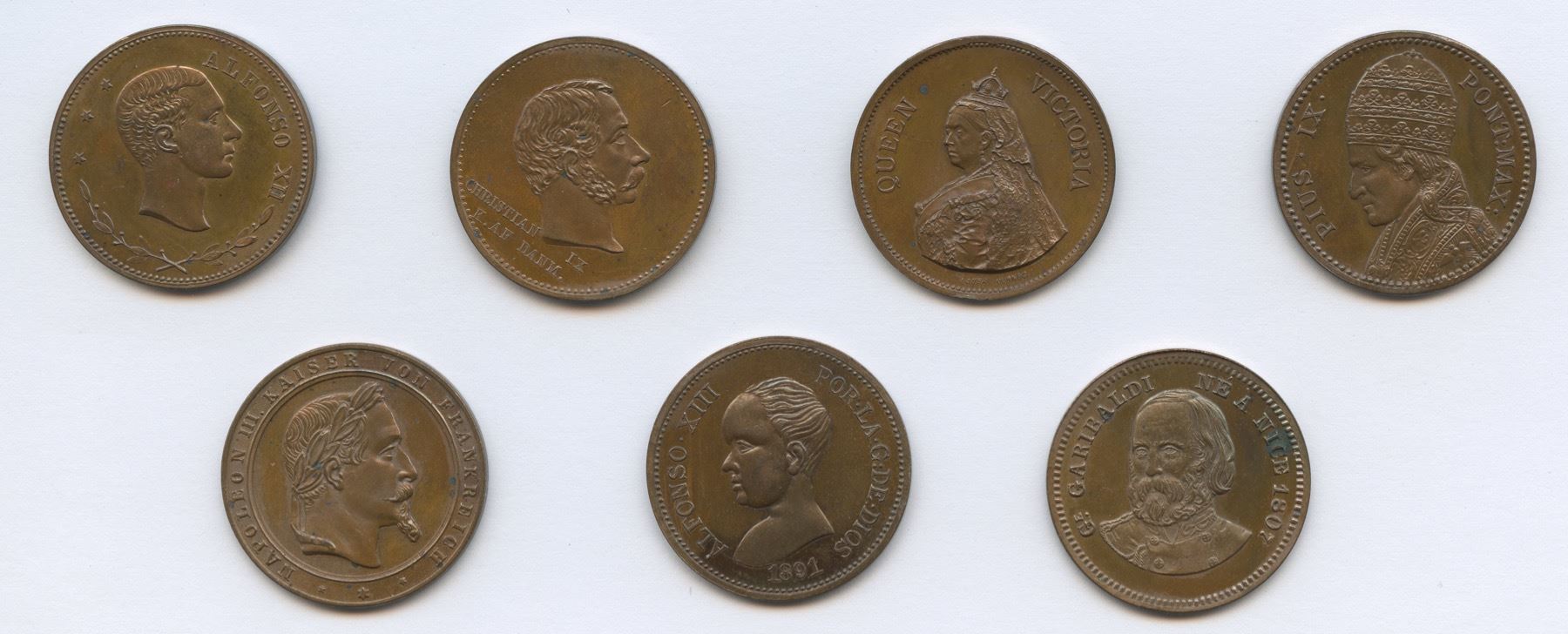 This lot includes: BR 591, Alfonso XII; BR 592, Christian IX; BR 593, Victoria; BR 594, Pius IX; BR 595, Napoleon III; BR 596, Alfonso XIII; BR 597, Garibaldi. Each features toned glossy brown surfaces with mirrorlike fields. Extremely rare and worth a premium bid.