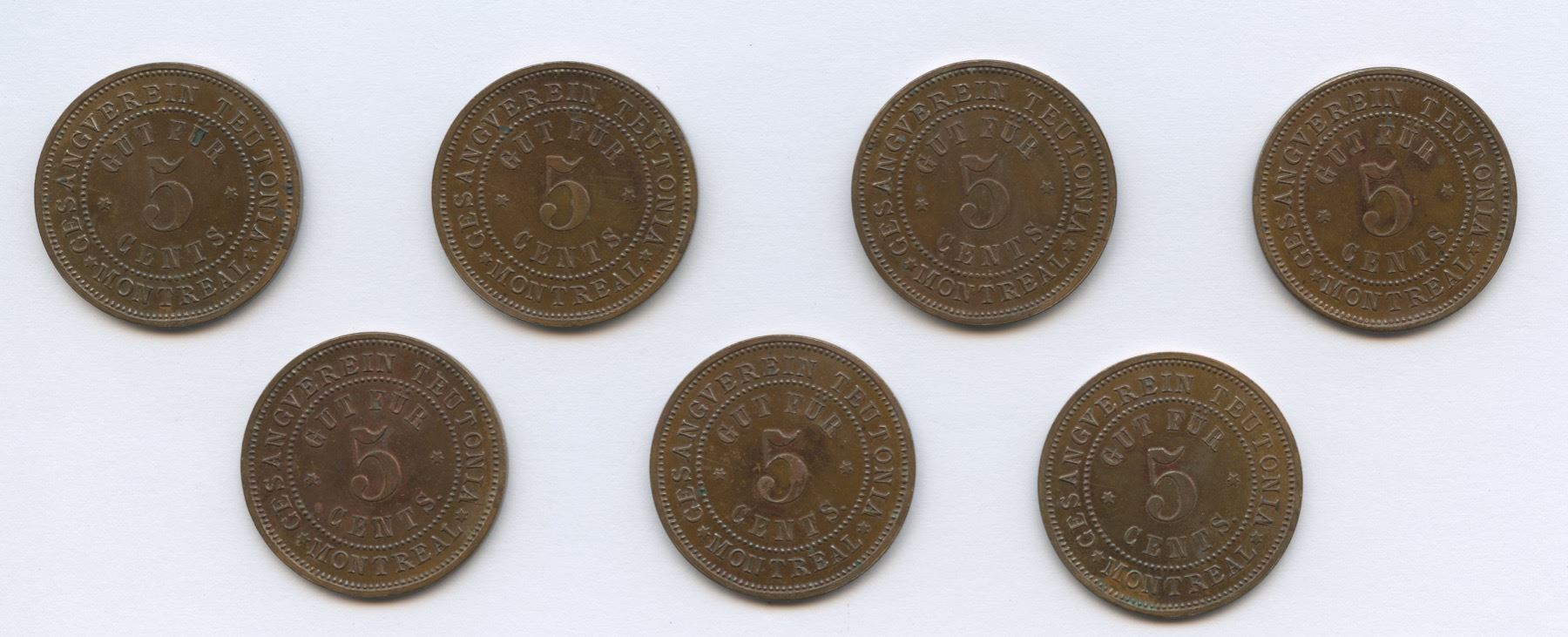 Lot of seven pieces. A near-complete set of these extremely rare post-Confederation tokens struck in copper. According to P.N. Breton (1894), only three sets of Breton-590 to Breton-597 were produced “in commemoration of different kings and other rulers who have reigned during the past fifty years.” Although the tokens were ostensibly struck for the Montreal German Glee Club (Gesangverein Teutonia), which was founded in 1835, it is unknown who made them or why. The Breton-590 to Breton-597 set appears to be much rarer than its counterpart (Breton-598 to Breton-605). Michael Joffre has never come across another set in all his years of looking, and this cataloguer can find no record of another public appearance.