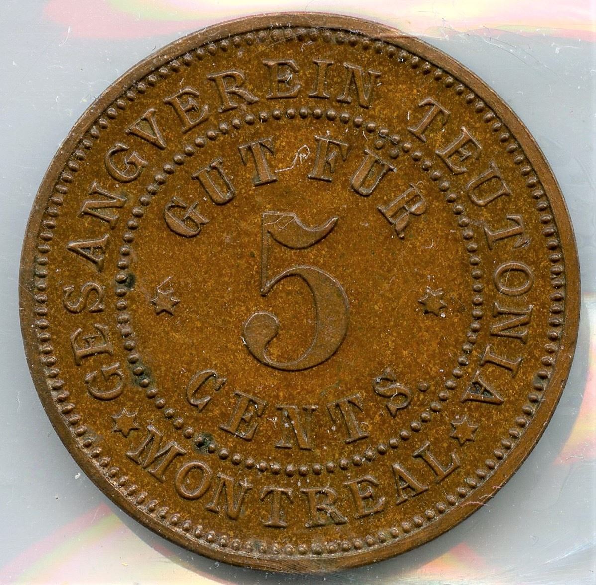 Montreal, good for 5 Cents, bust of Kaiser Wilhelm, Br. 600, Copper, Graded Proof 65 by ICCS. Very attractive and scarce.