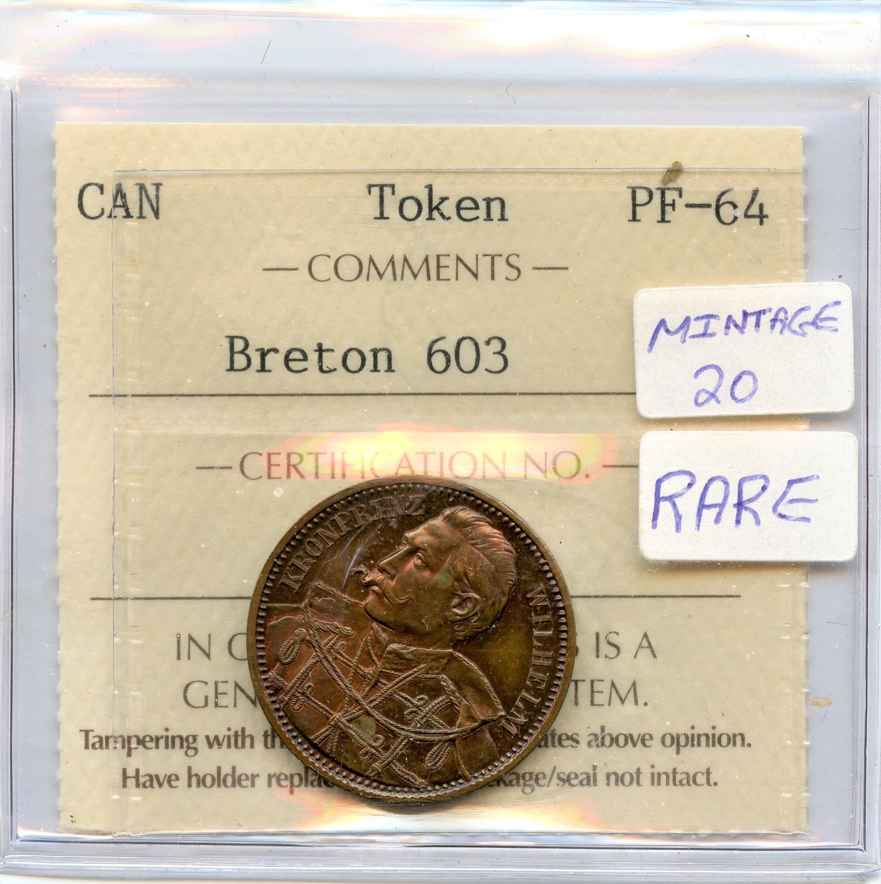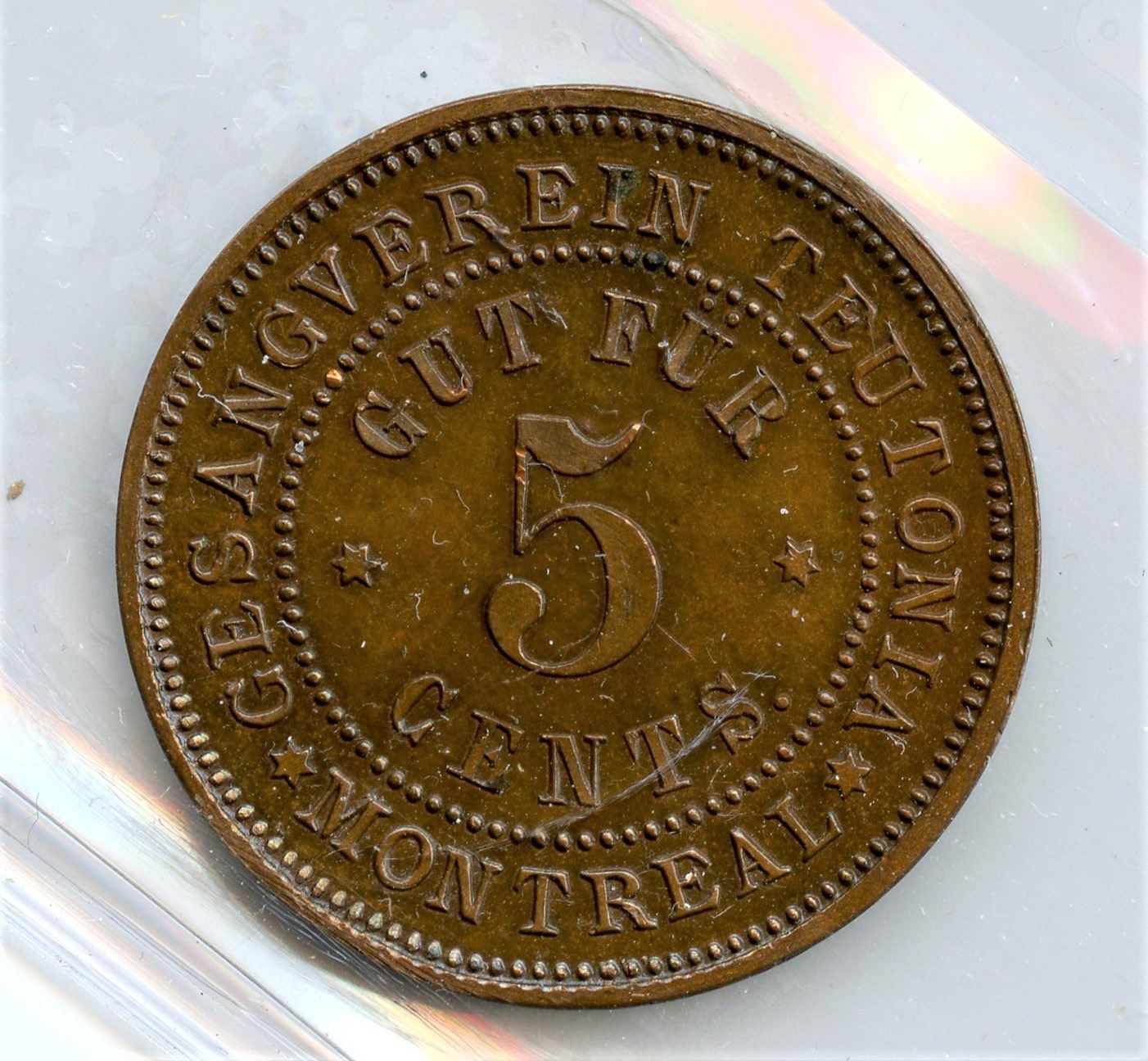 Montreal, good for 5 Cents, bust of Kronprinz Wilhelm, Br. 603, Copper, Graded Proof 64 by ICCS. Very attractive and scarce.