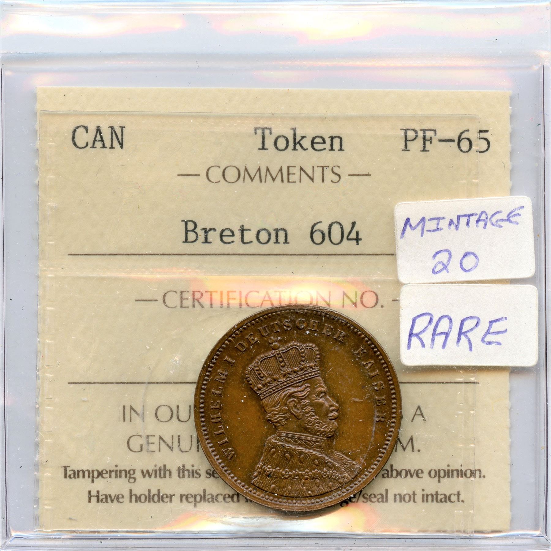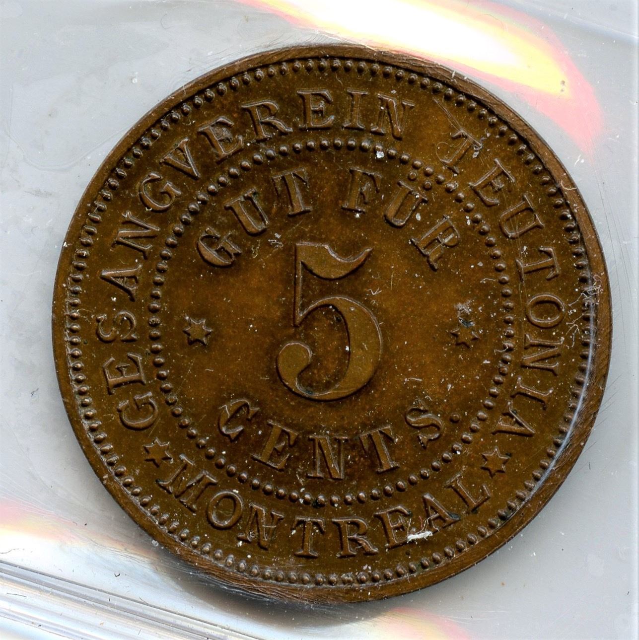 Montreal, good for 5 Cents, bust of Wilhelm I Deutscher Kaiser, Br. 604, Copper, Graded Proof 65 by ICCS. Very attractive and scarce.