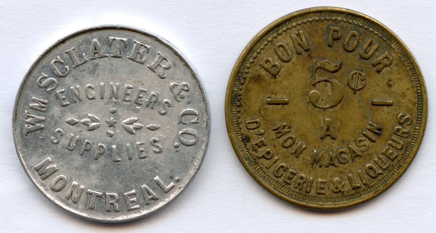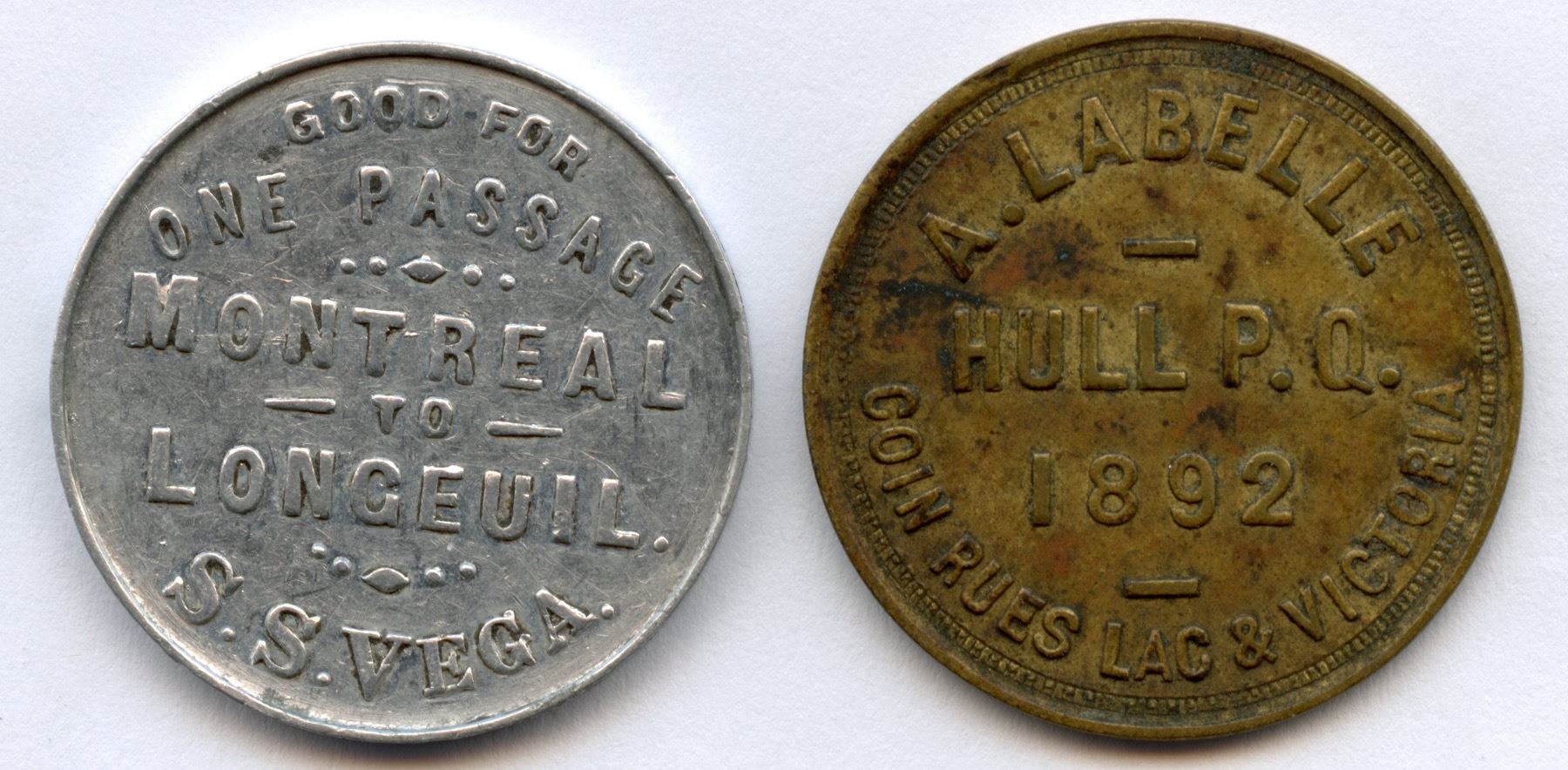 Wm. Sclater & Co.'s, Montreal, Advertising Token, Combined with his offer of passage on the S. S. Vega from Montreal to Longueuil. Al. VF. Br 652. A. Labelle's Token, Hull, 1892. Bon Pour 5c. Brass. (200 issued) EF. 2 pcs.
