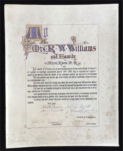 A beautifully executed piece of calligraphy to Mrs Williams and Family From the Board of Examiners of the Pharmaceutical Association of the Province of Quebec regretting the absence of her late husband and expressing sympathy on his passing. The 9x13” piece appears to be done by W Greig of Montreal. It has some yellowing but would make a great framed item.