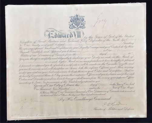 A certificate of appointment to John Lewis Williams Son of R.W. Williams, to the rank of Lieutenant in the Militia of Canada. It is dated 1907 and is signed by the Minister of Militia and Defence F.W. Borden. It is also counter-signed by Governor General Grey. A wonderful piece of Canadian history with two important signatures.