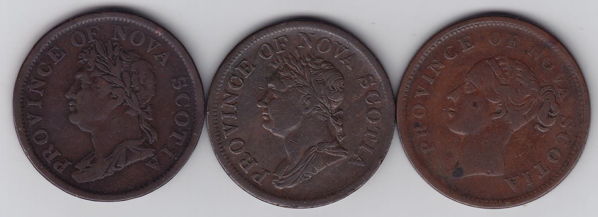 CH NS-2A4, 1824 one penny, F; CH NS-2B1, 1832 one penny, F; CH NS-2D2, 1843 one penny, VG. 3 Pcs.