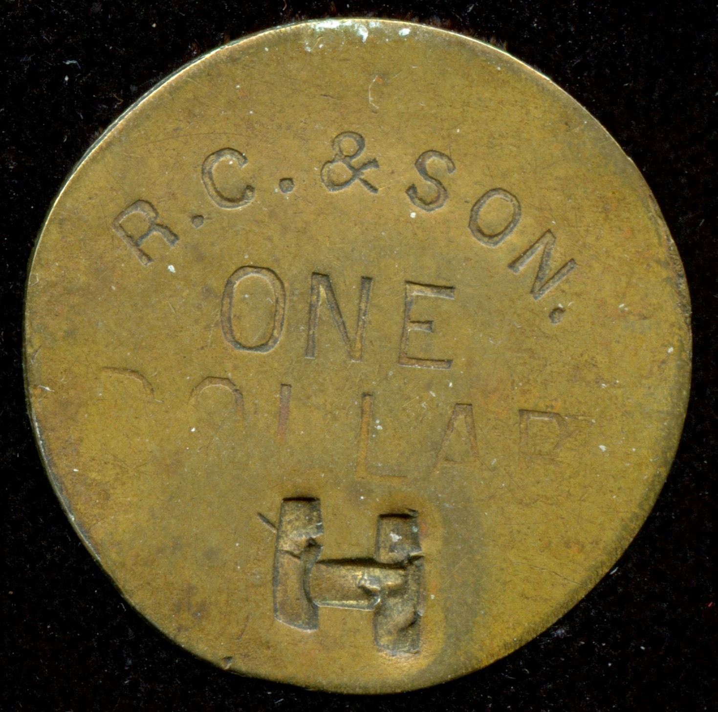 Robert Cunningham & Son. One Dollar Trade, Hill H3410f, brass, round, 29mm, and counterstamped with “H” for Hazelton. No trace of “Skeena, B.C.” Uniface, incuse. F. Scarce.