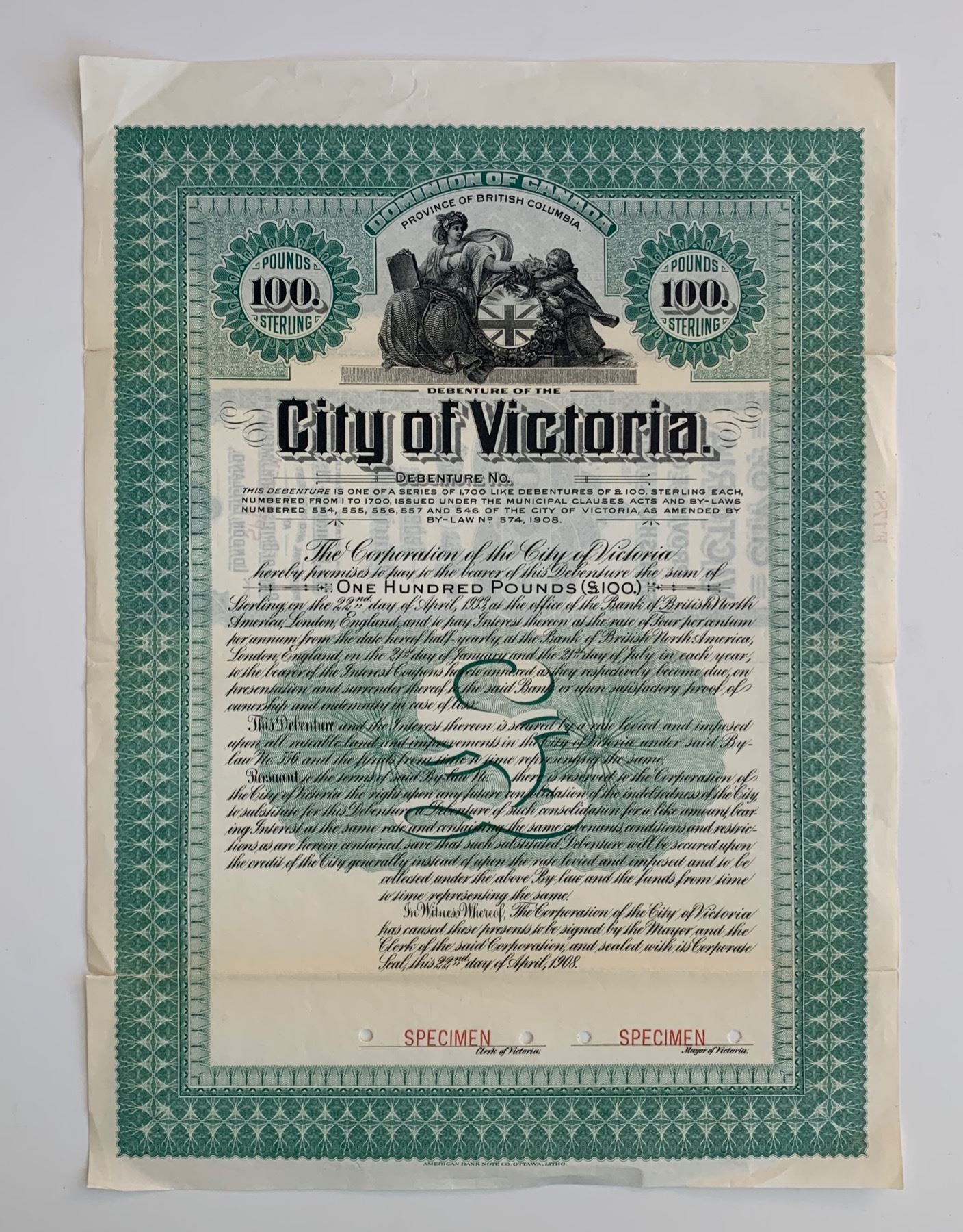 Includes: City of Victoria 100 Pounds Sterling, specimen & The Guinea Gold Mines Company of B.C. Limited for 500 Shares. 2 Pcs.