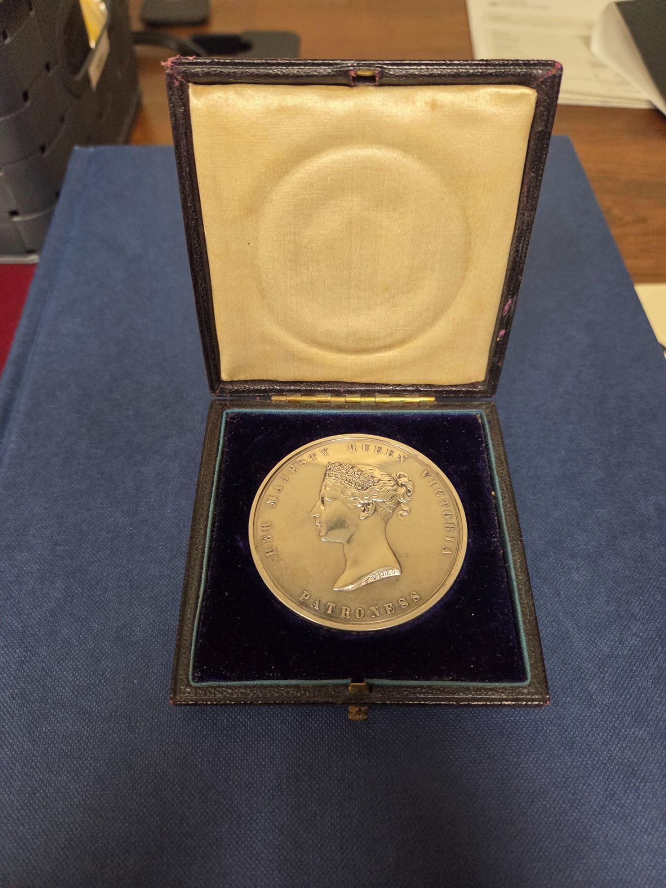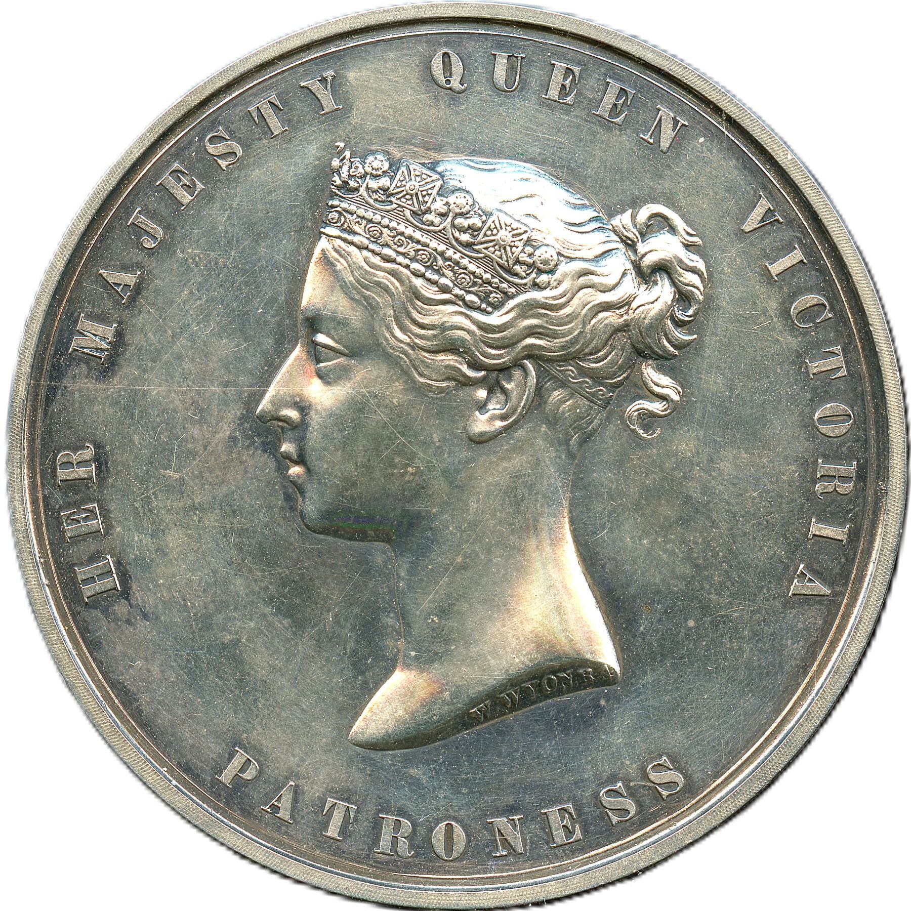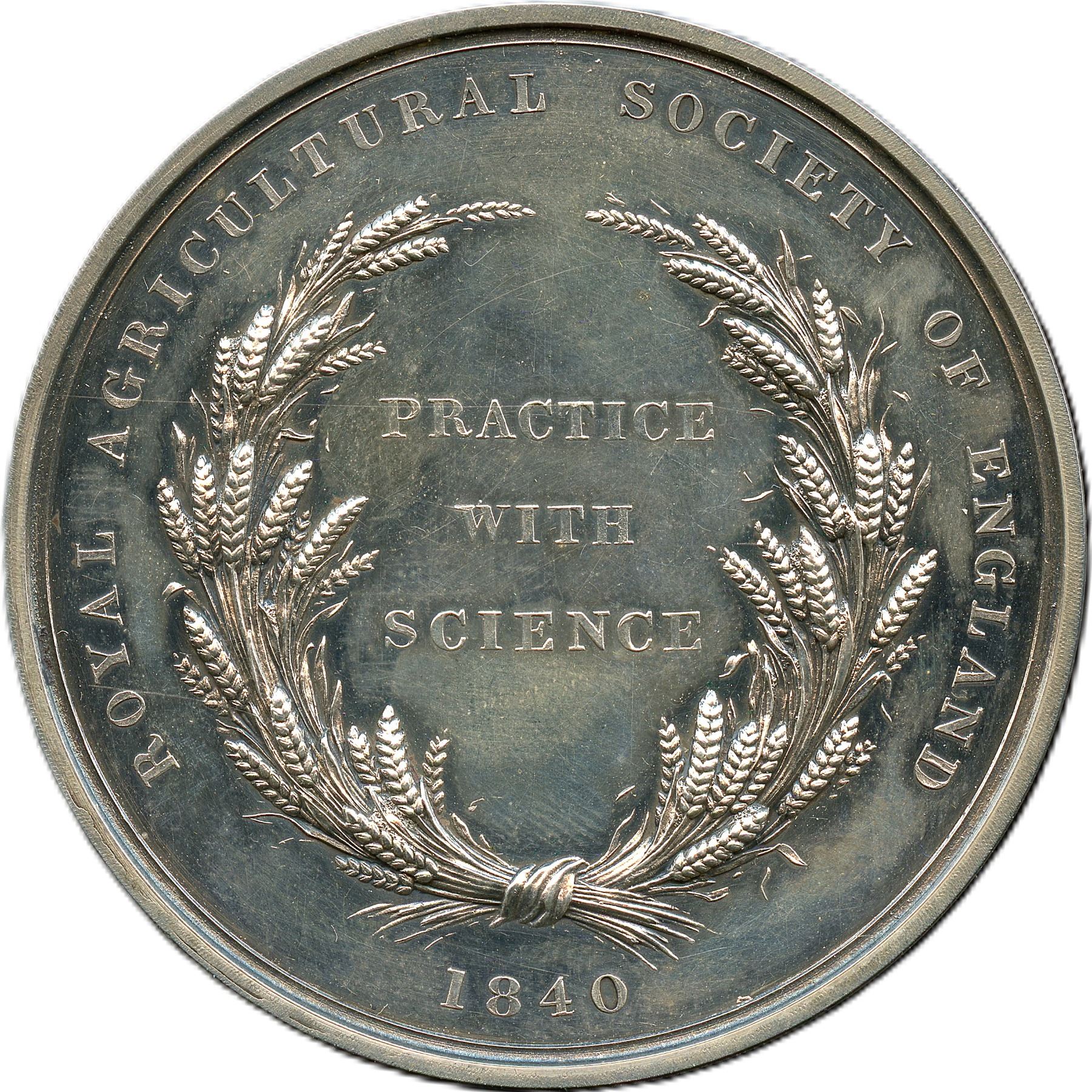 British Historical Medal. Royal Agricultural Society Of England 1840 Medal Silver. Signed W. Wyon. Eimer 1340, BHM 1985. 54.4mm, 90.2g (2.6824ASW). Obverse: Bust of Queen Victoria to left. Awarded to (edge engraved) "F.L. Clunes, Newcasle Under Lyme, Staffs, For Proficiency In Cattle Pathology, 1892." Housed in a black leather wooden box with blue velvet and white silk interior, case is warped and does not latch. AU.