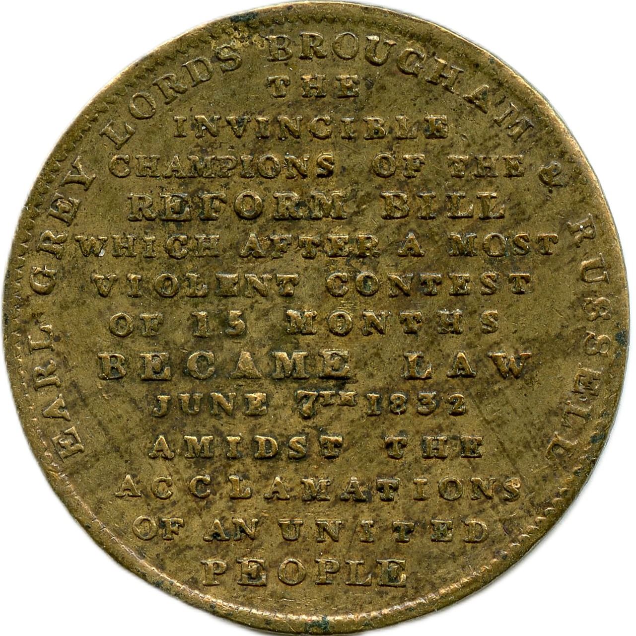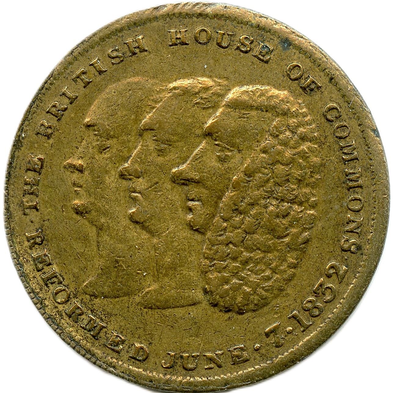 Duchess of Gloucester 1774, by Kirk F., Bronze, 5.74g, 26mm, F; 1832 British House Of Commons Reform Bill, Brass, 4.70g, 27mm, VF; William IV Died June 20, 1837, Brass, 4.08g. 24mm, VF; Windsor Castle Tin, 2.61g, 23mm, VF, containing a Miniature medal of Princess Alice Birth 1843, Brass, 0.31g, 8.5mm, F; Withers 2100, 1831 Ilse Of Man Half Penny Token, 8.24g, 28.5mm, F. 6pcs.