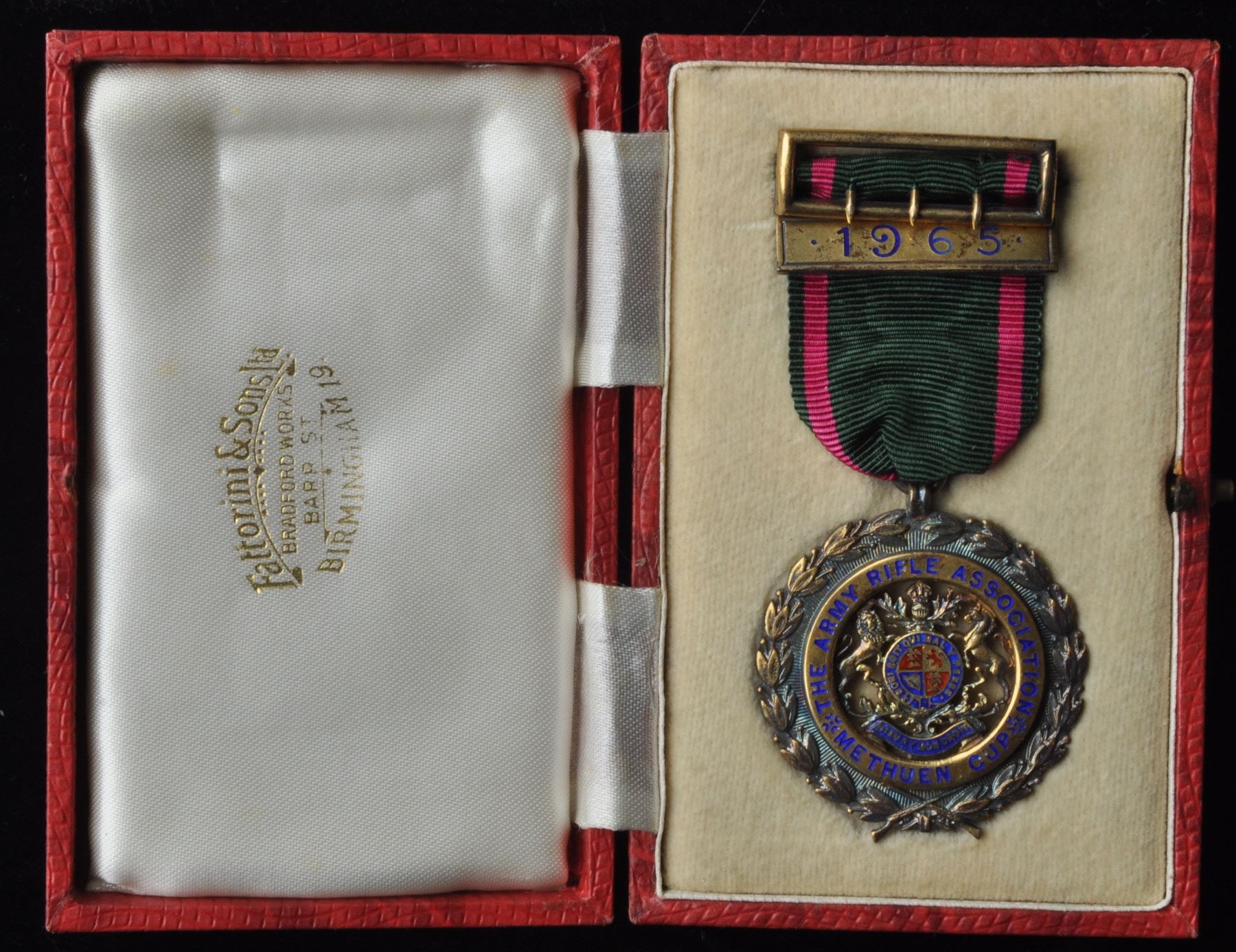 National Rifle Association 1860, White Metal, 57mm. National Rifle Association 1860, White Metal, 48mm. National Rifle Association 1860 Recruit, Bronze, 32.5mm. Bell Medal, Presented by The Society of Miniature Rifle Clubs, Bronze. Field Marshal Lord Roberts of Kandahar, Society of Miniature Rifle Clubs, Brass. Yorkshire Miniature Rifle Association, Copper. The Army Rifle Association Methuen Cup suspended with green ribbon and 1965 Bar in original box. Territorial Army Rifle Association, awarded to 1961 SMG Team. F-EF. 8 Pcs.