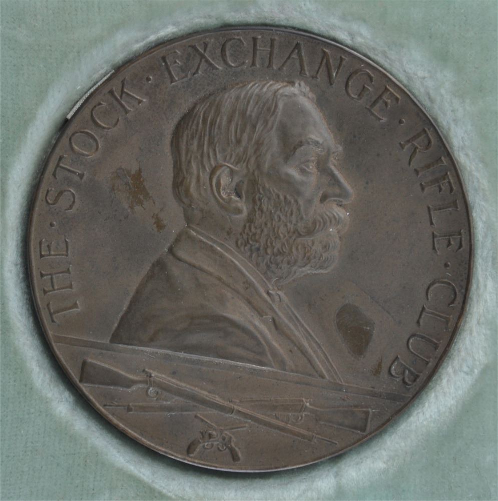 55mm, bronze. Obv. Bust of man with The Stock Exchange Rifle Club around edge with guns at 6 p.m.; Rev. Wreath with center blank space for engraving, 93.7 gms, AU in case of issue, unnamed.