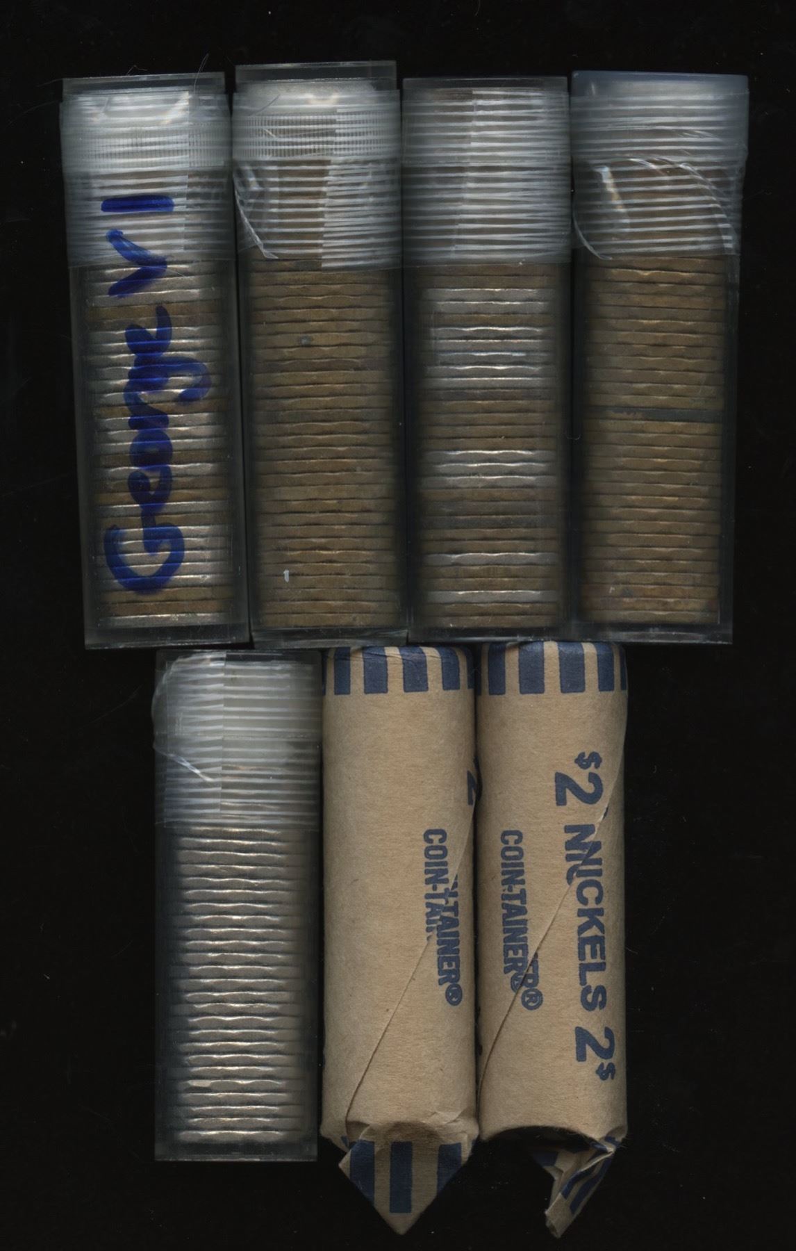 Bulk lot of circulated 5c: two rolls of George V, one roll each of 1942 and 1943 Tombac coins (better grades), partial roll (30 coins) of 1948, and two mixed George VI rolls (with lots of tombacs).